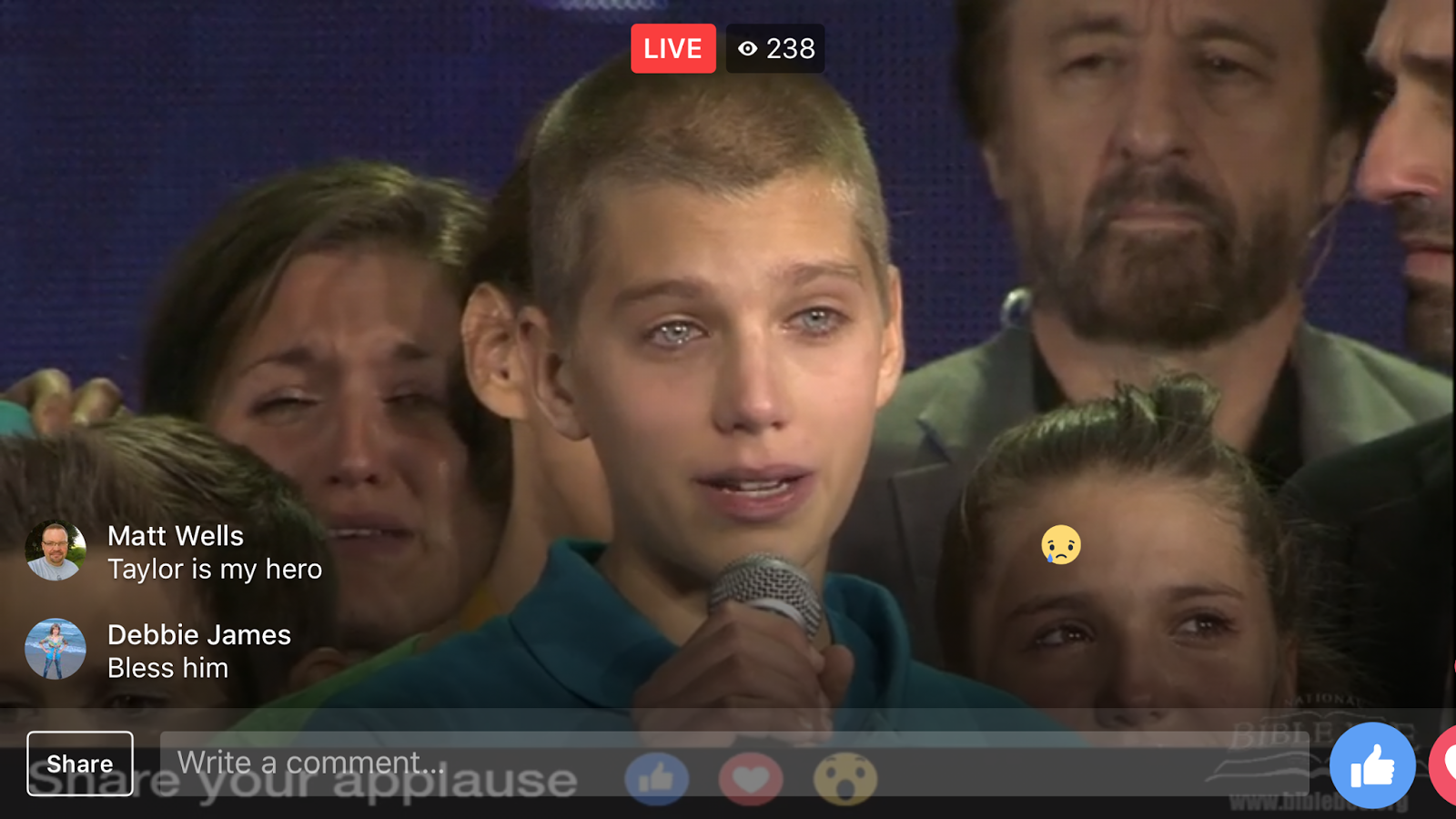 Love this picture. Not because of the celebratory music playing. Not because of the wild and enthusiastic cheering of hundreds of people. Not because of the confetti or flashing lights or anything of that. I love this picture because I see the first place winner, that fourteen-year-old young man who had just won $100,000.00…looking upwards and signifying by doing so that ALL of the honor and glory was due to Jesus.