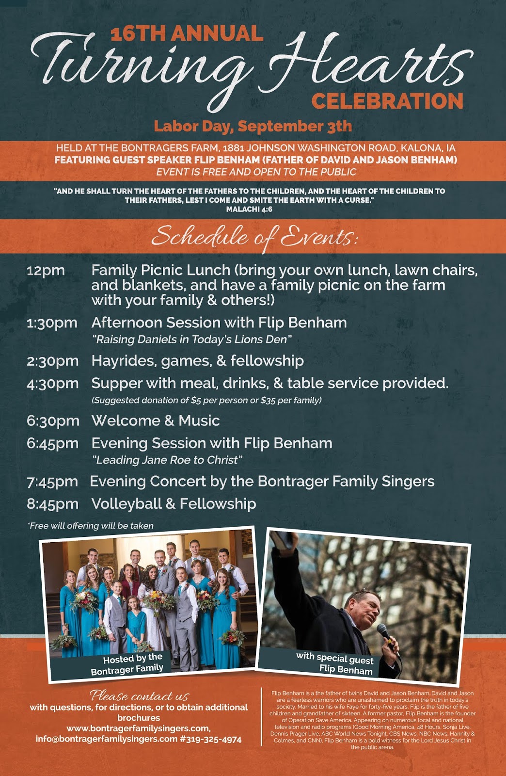 This year, though, we are looking forward to welcoming all of you to our farm once again for a day of family encouragement. The Celebration will feature guest speaker Flip Benham, father of David and Jason Benham.