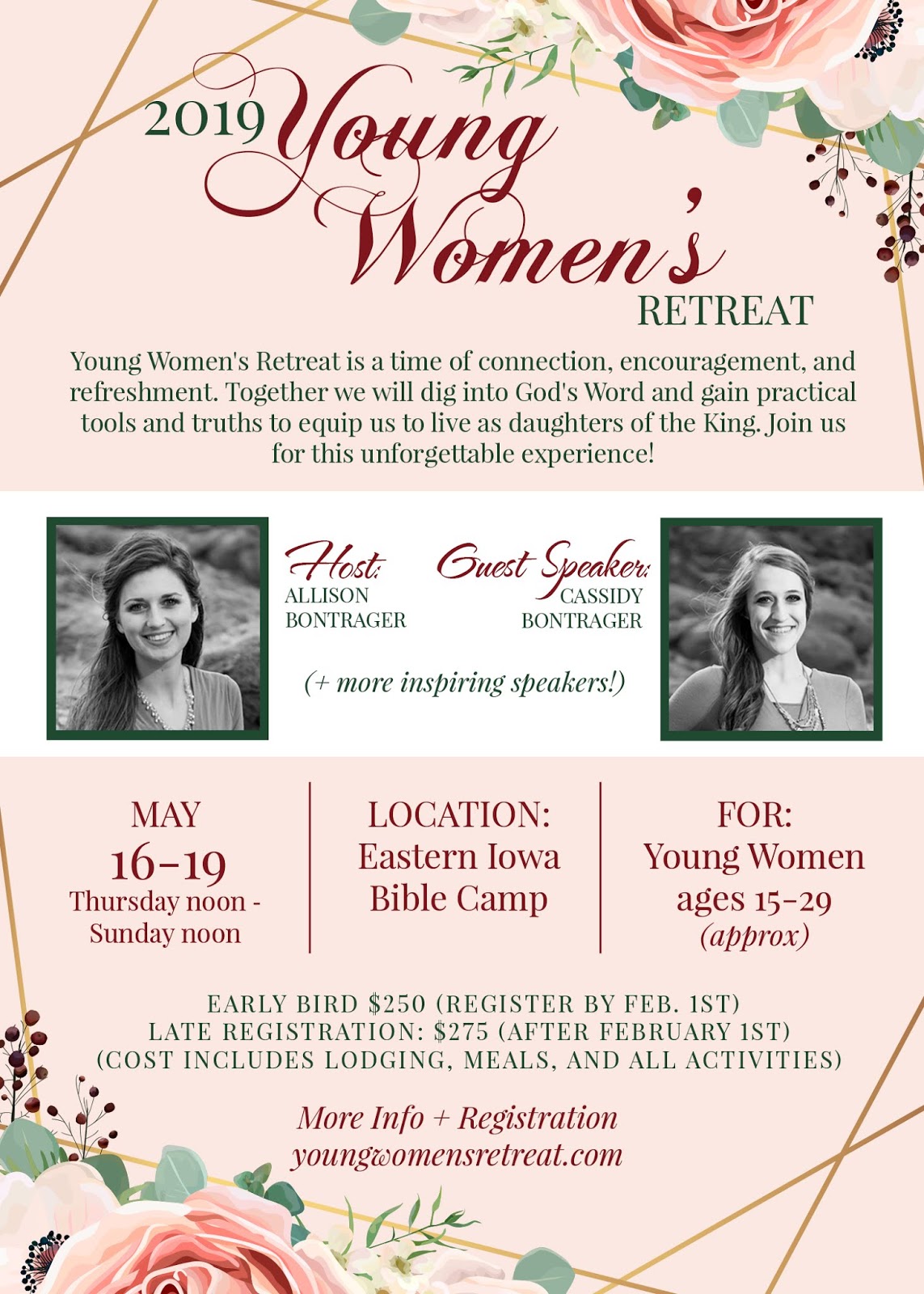 There is a wonderful opportunity coming up in May for all young ladies! Allison is doing a young women’s retreat in Iowa during the same time that Denver is hosting his Mighty Men Camp! This is a wonderful opportunity for brothers and sisters to enjoy a road-trip to Iowa together. I (Liz)would highly recommend this wonderful retreat! I enjoyed being able attend last year and I greatly enjoyed it!
