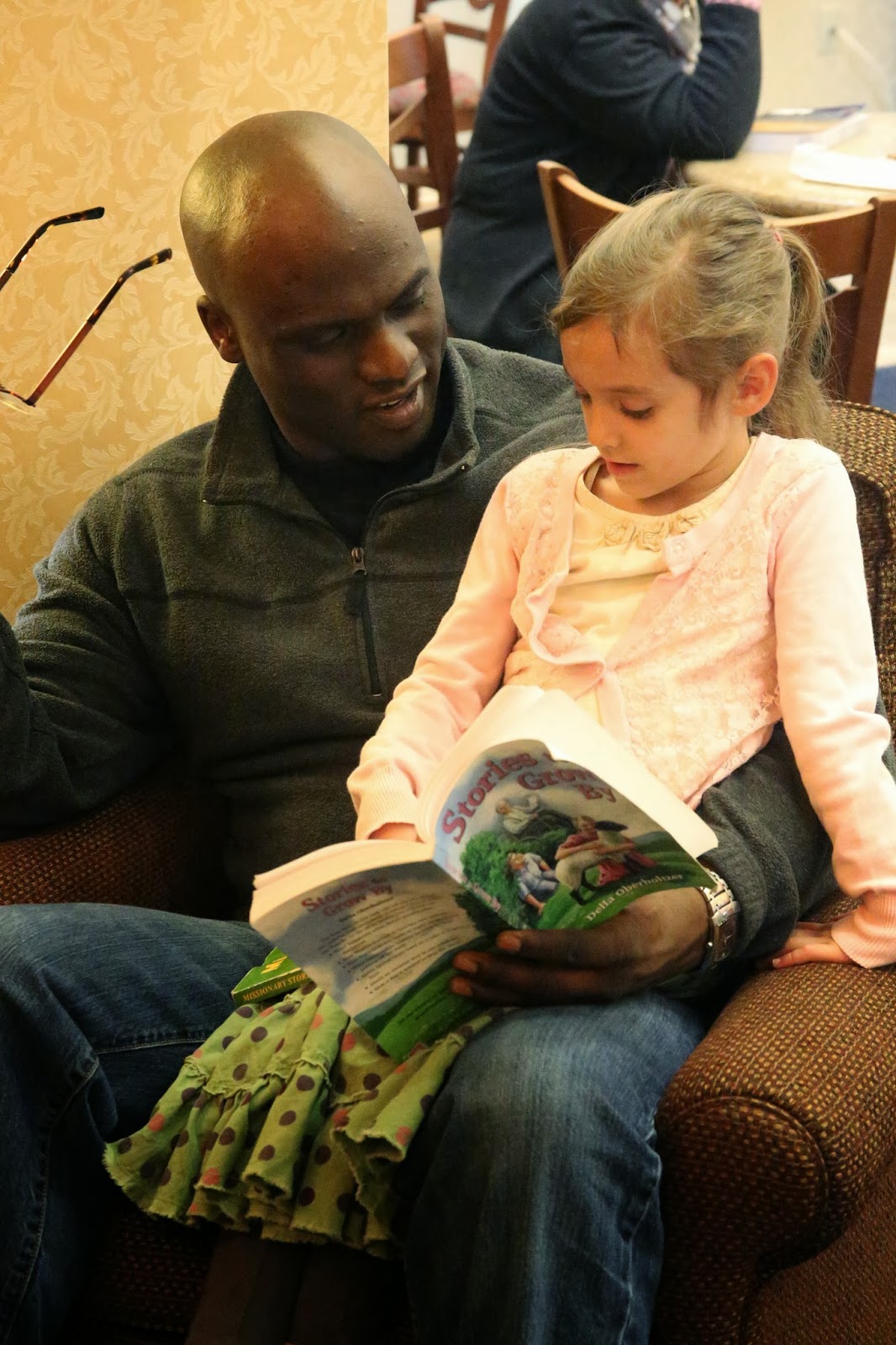 Rebecca enjoying story time with our friend Troy @ the hotel.