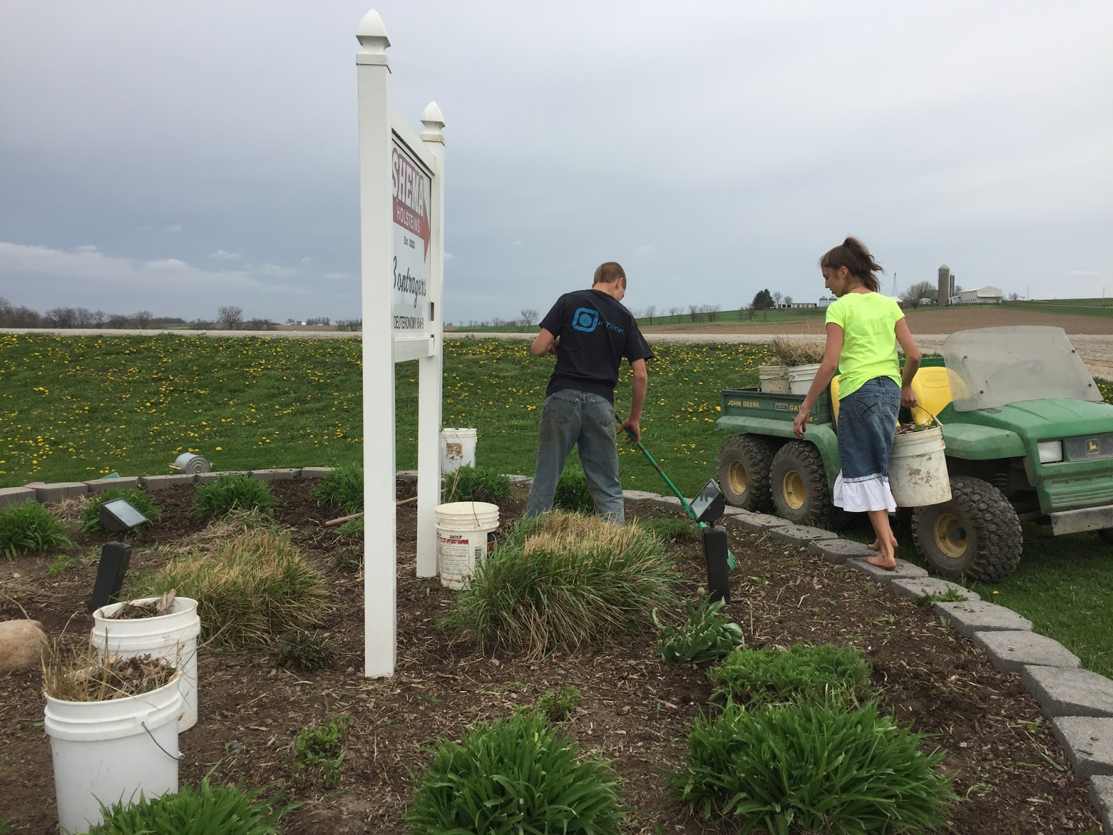 Taylor and Liz, weeding and clearing out one of our big flower beds, out by the barn sign.