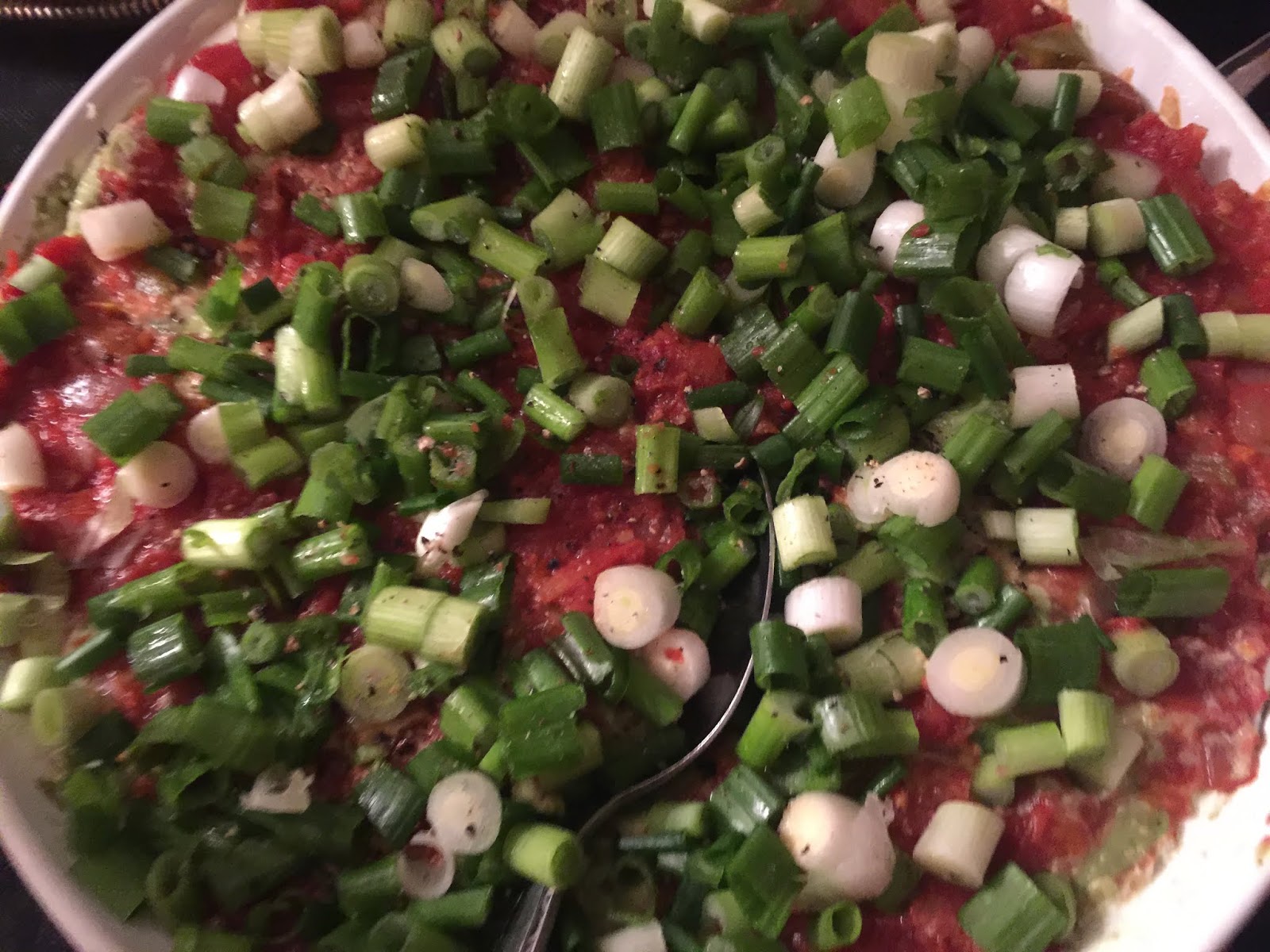 Another delicious Mexican dish, a layered dip of cream cheese, salsa, cheese, guacamole, and green onions, was made by Taylor.