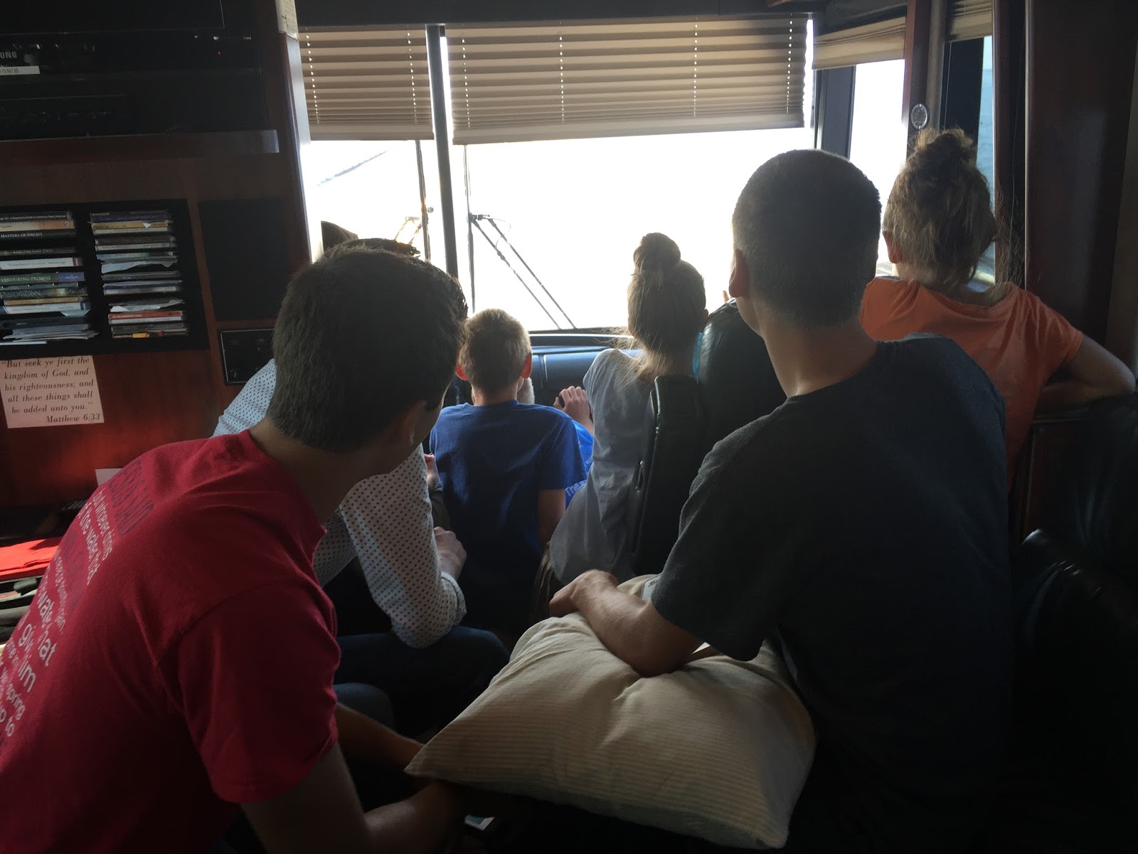 Hanging out at the front of the bus to watch our crossing over the bridge and offer helpful advice to the driver. =)