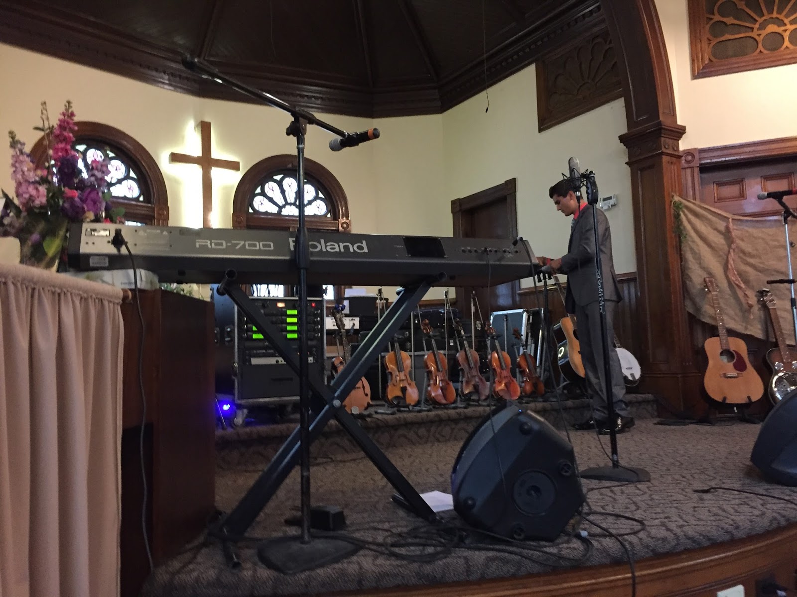 Josh checking instruments a few minutes before our evening concert in Summerside.