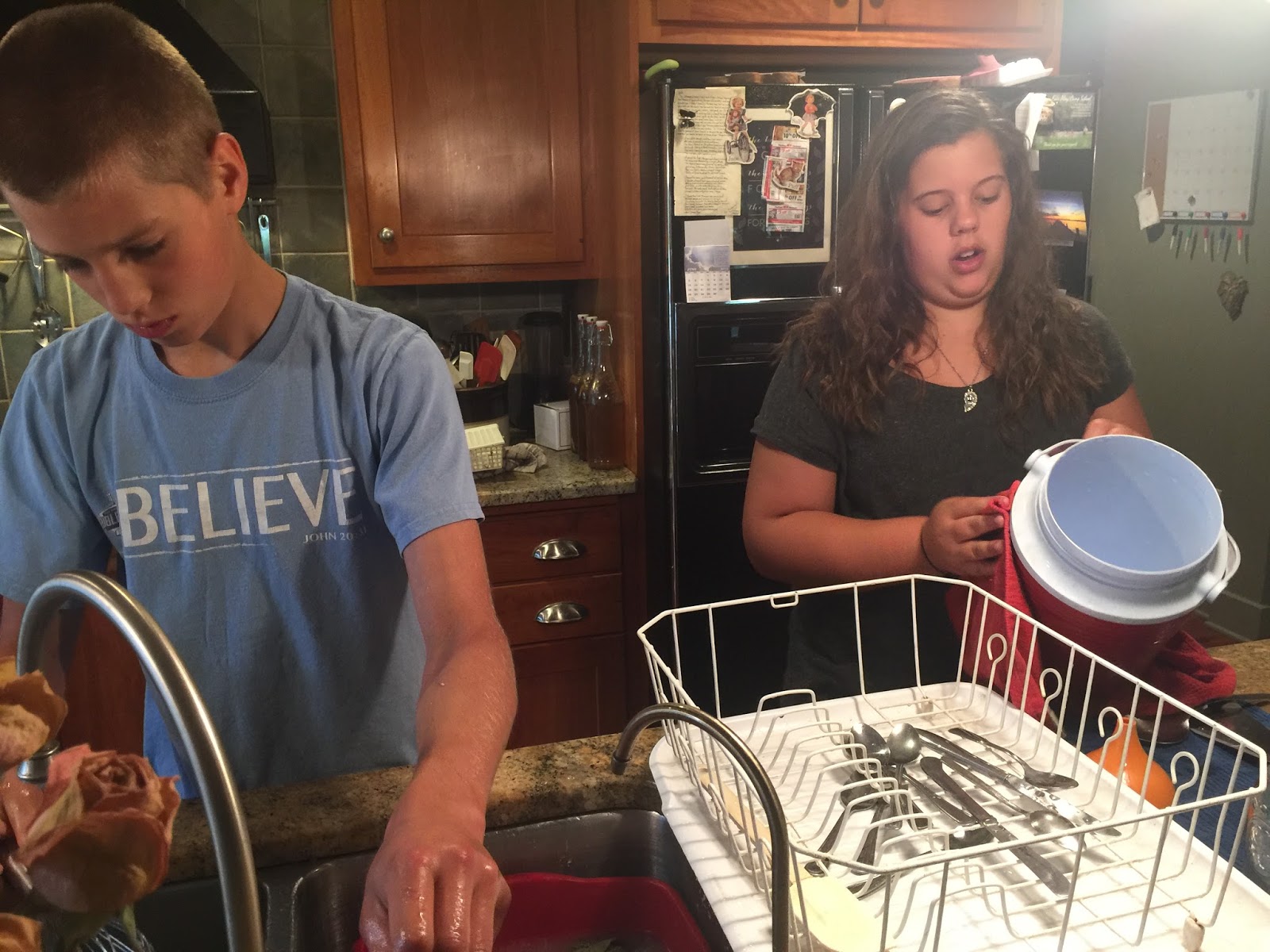 Big family get-togethers mean lots of dishes to wash! Here we have Taylor and cousin Bekah on KP.