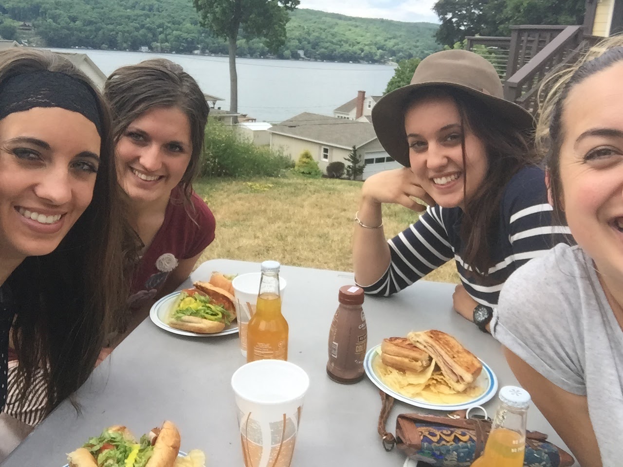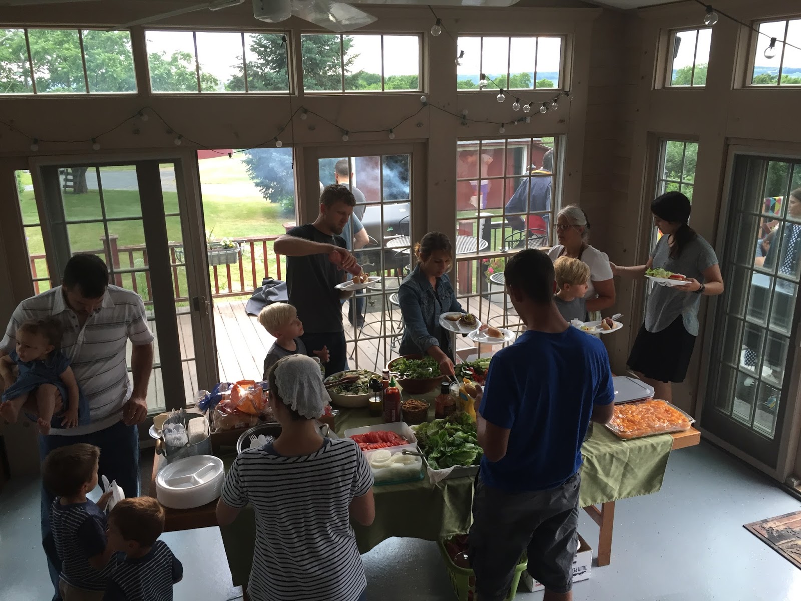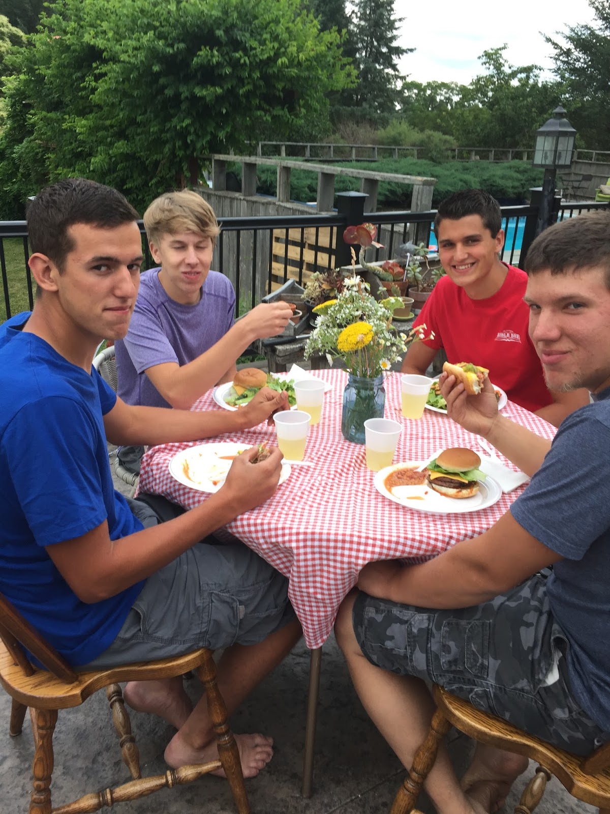 An alfresco dinner of hamburgers, salads, and grandma’s famous peach delight.