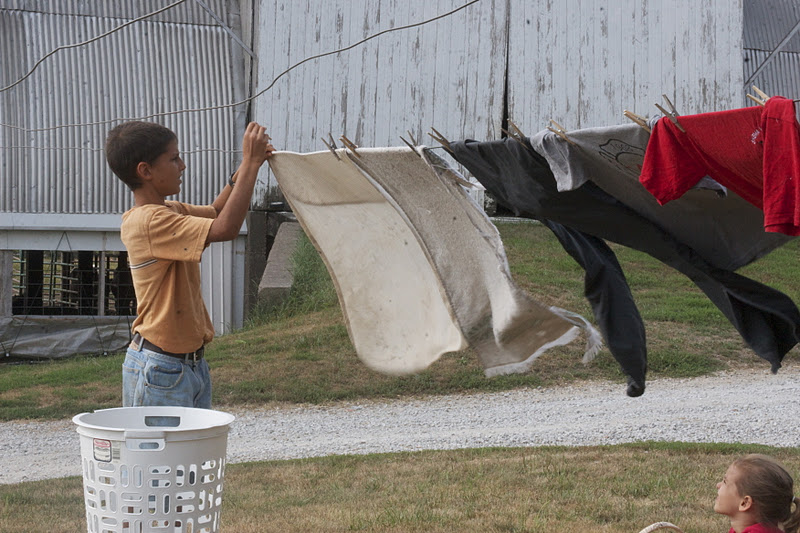 Liz begged me to teach her how to iron, so I did. Fifteen seconds into her first try she burnt herself, but got right back to it again. This is one of her favorite jobs-ironing the boys’ handkerchiefs.
