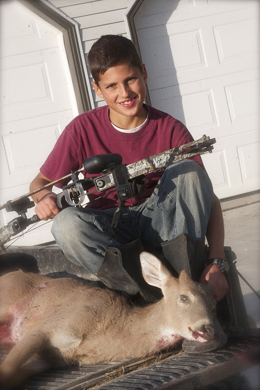 Denver went out hunting for the first time this year, and on his very first try….got a little buck, just his size. =) We were all thrilled for him.