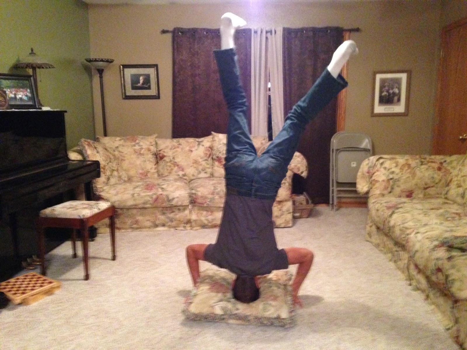 Denver continues to work hard anywhere and everywhere to improve his various skills. The current challenge amongst him and several of his friends is to see who can stay upright, upside down, the longest. =)