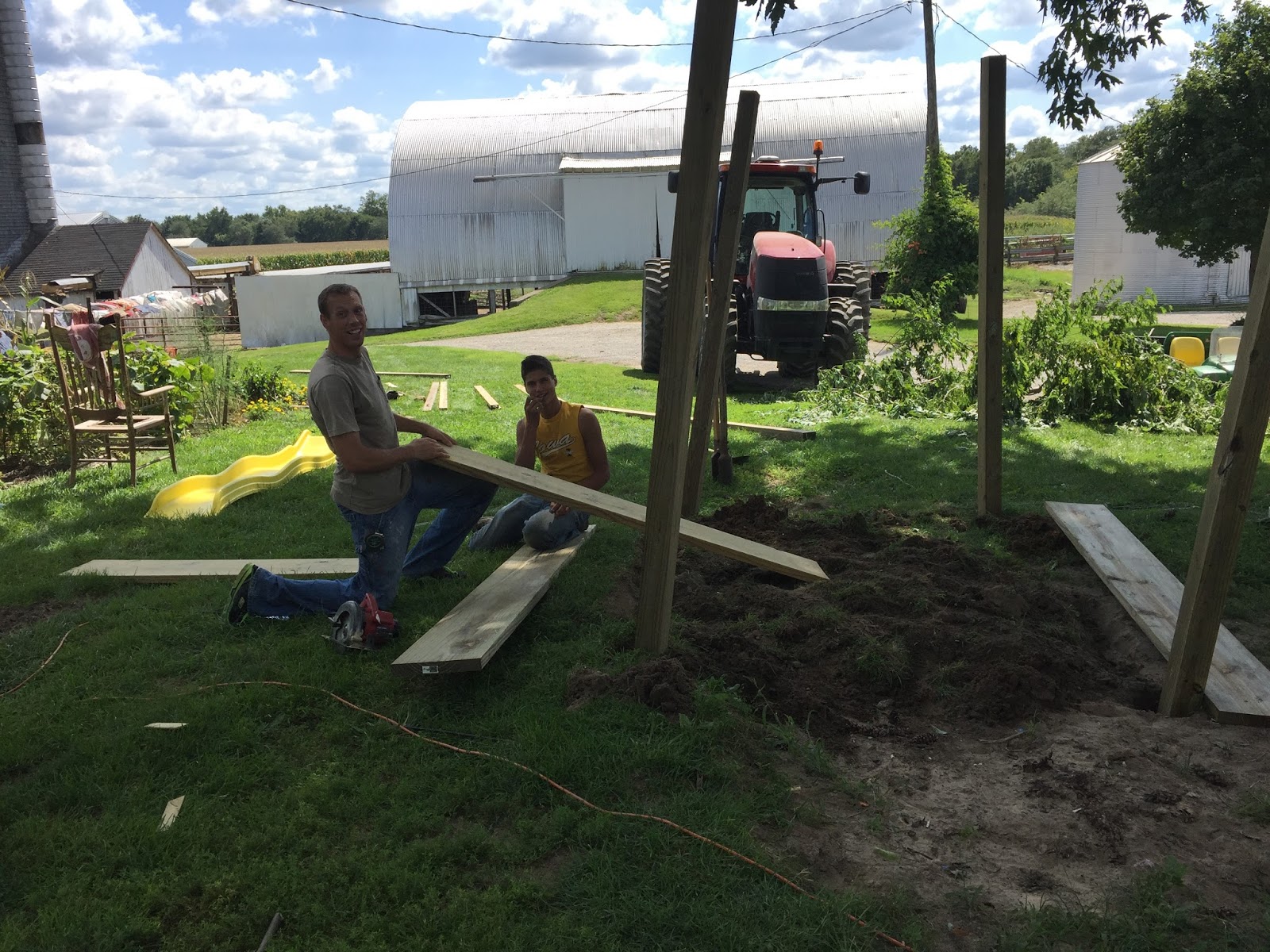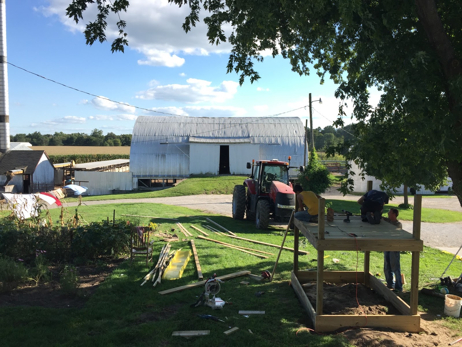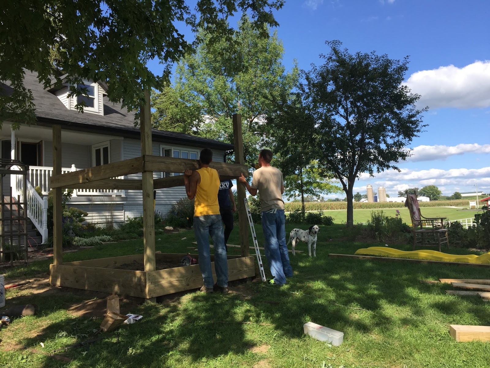 As promised in this post, we have a few pictures of the tree-house building saga. True to Bontrager form, the actual building portion of the project was left until the ninth hour. As in…literally the last board was put in place half an hour before Denver’s graduation party. Denver did a great job planning/designing/organizing the project, and we’re very thankful for the brothers + friends who pitched in and worked so hard to help him and get it finished in time.