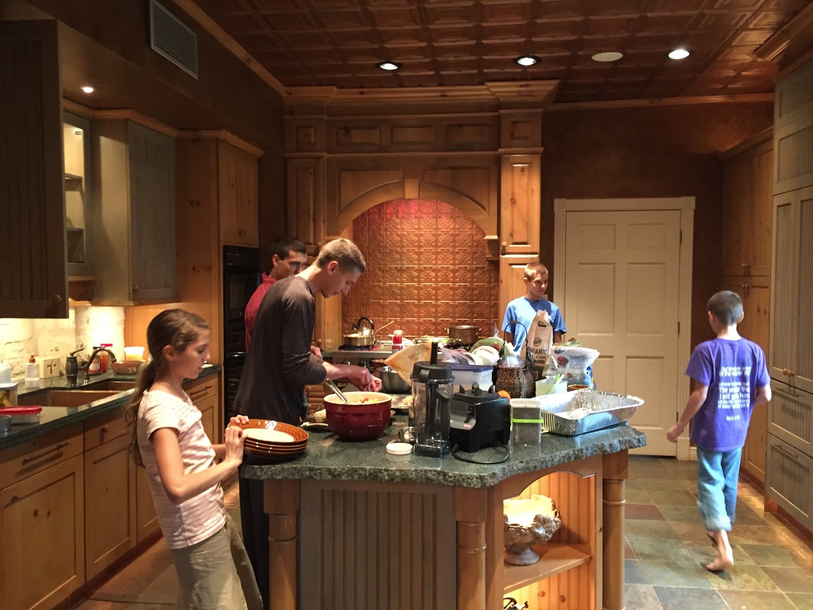 We cooked all of our own meals while there. It was great fun to have a big and fully stocked kitchen to use! Everyone got in on the action and signed up for preparing various meals.