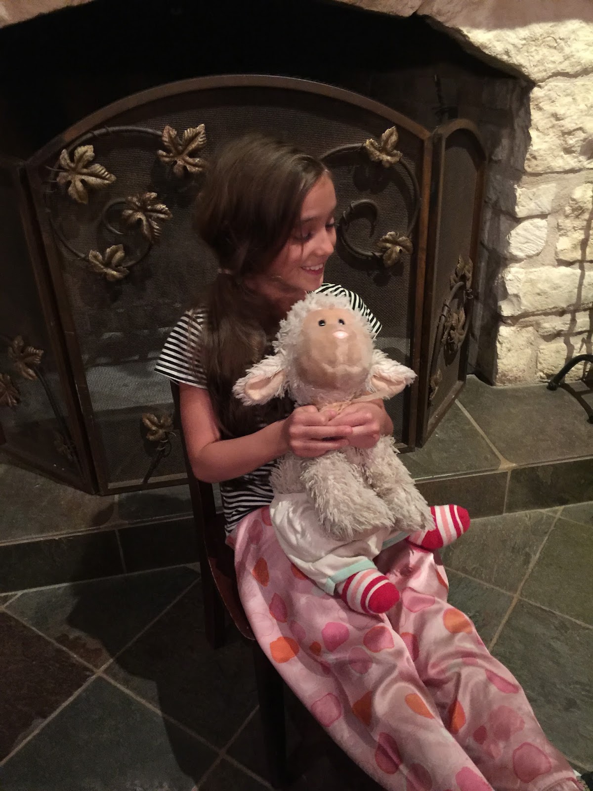 Rebecca, chilling in style (hmmm) in front of the fireplace.