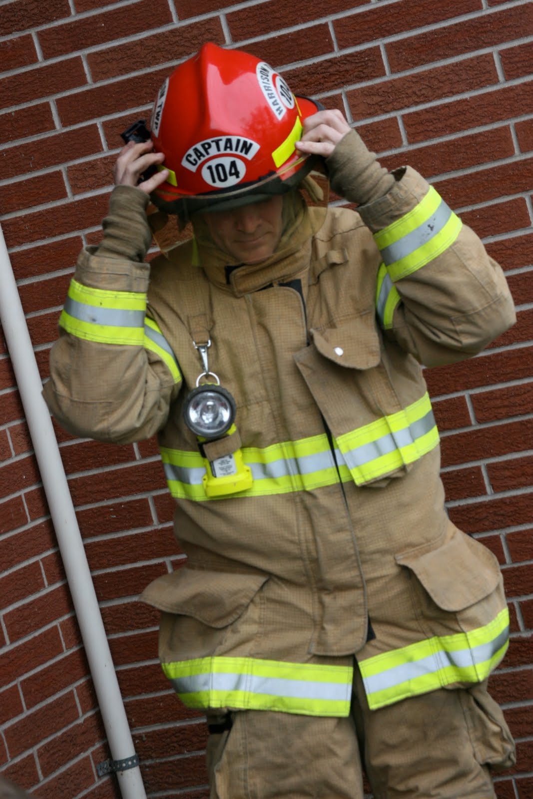 Our boys got out the stop watch while Mr. Martin put on his fireman gear.  Final score:  1 minute and 5 seconds.