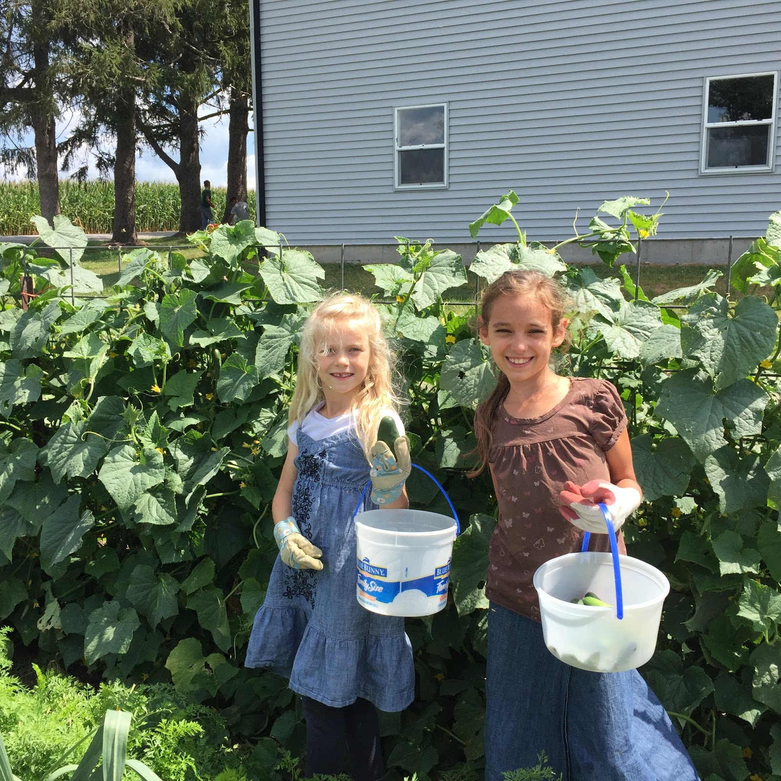 Rebs + her little companion, picking cucumbers from our very prolific plants.