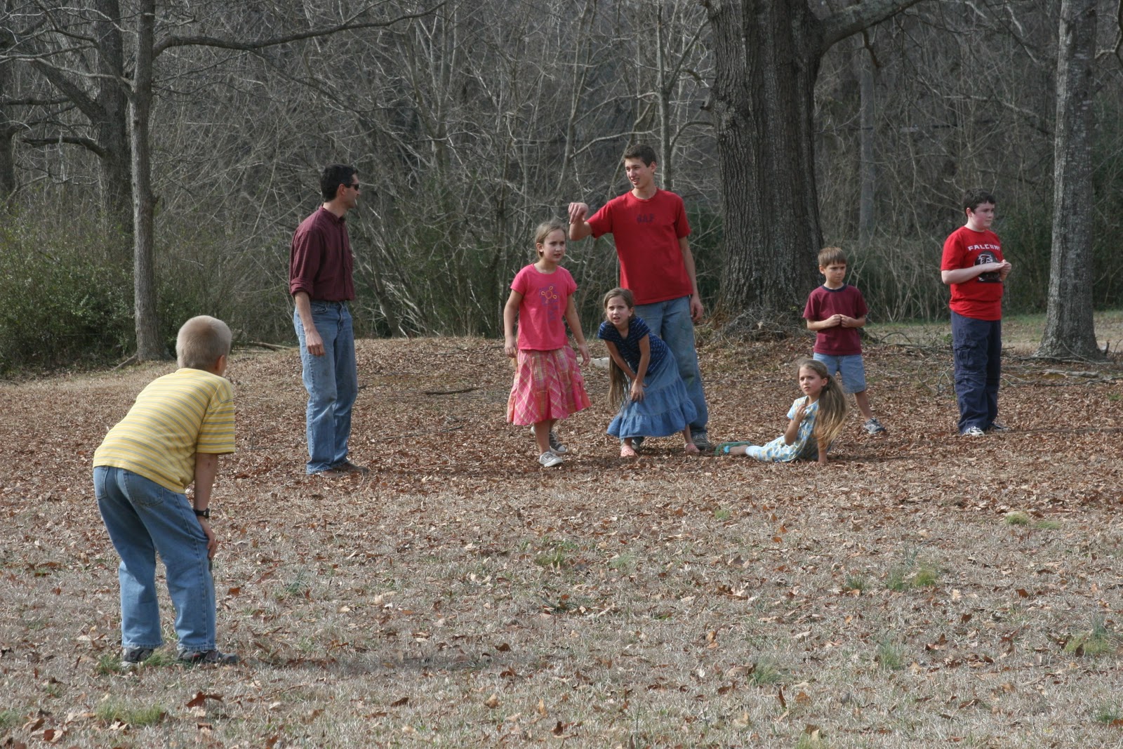 Yesterday we were all able to be together. We went to a nearby park and had a very rousing game of Dare Base. Everyone got in on the action, except for Rebecca & Harrison, who stayed very happy playing in the big pile of leaves that was right next by.