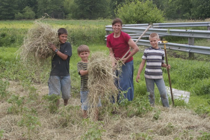 We've been mulching potatoes, too! Say, did you know you don't even have to put the potatoes in the dirt? Just put them on the ground and start mulching. It makes digging them up way easier! 😉