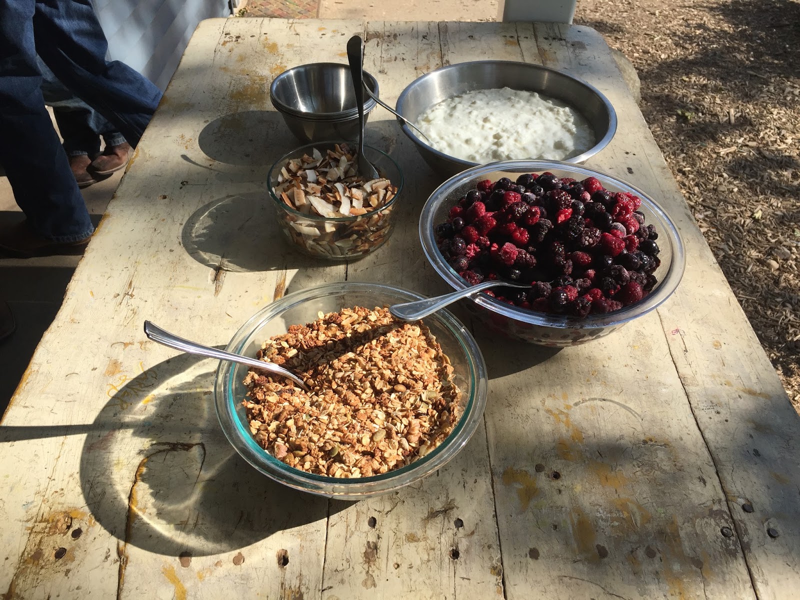 Tables ready for the hungry crew, looking lovely with fresh flowers and the morning sunlight.