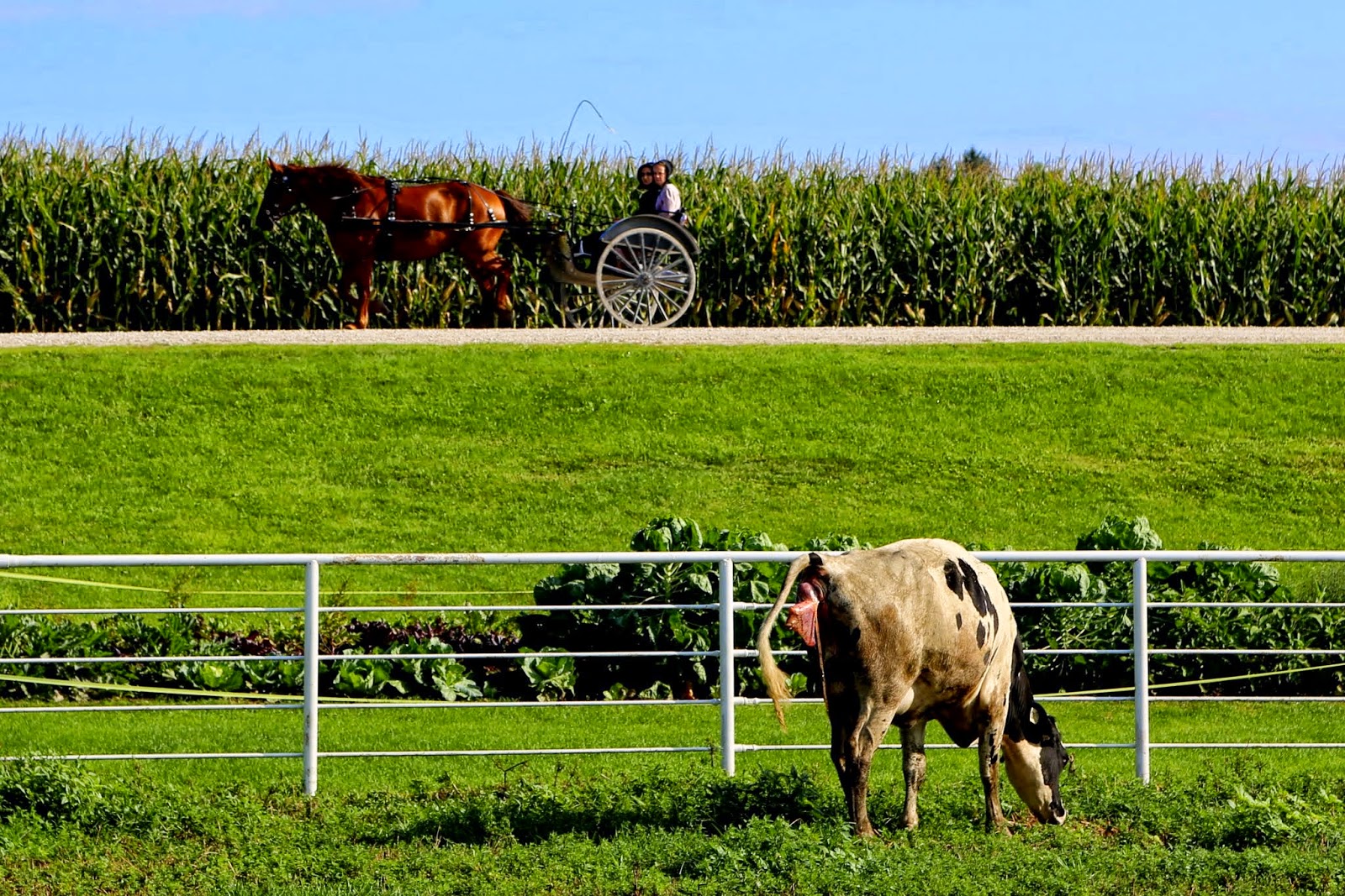 I love this photo! The blue sky, the bright green grass, the horse-drawn buggy, the corn field, and the cow (calmly birthing her calf:) all meld to create a beautiful image of country life.
