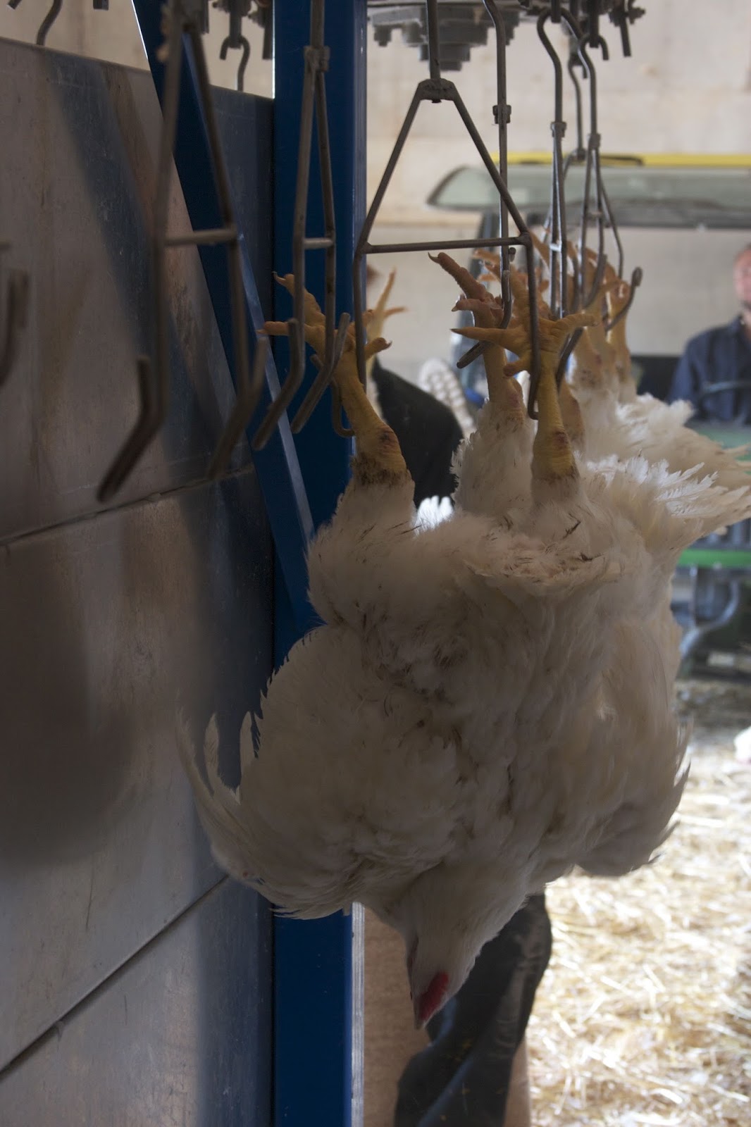 It started here, where several guys caught the chickens and hung them by their feet to the above racks on the conveyor.