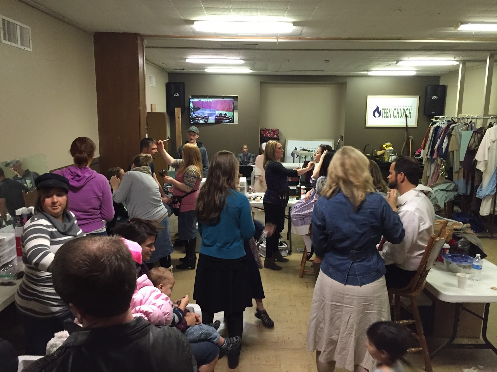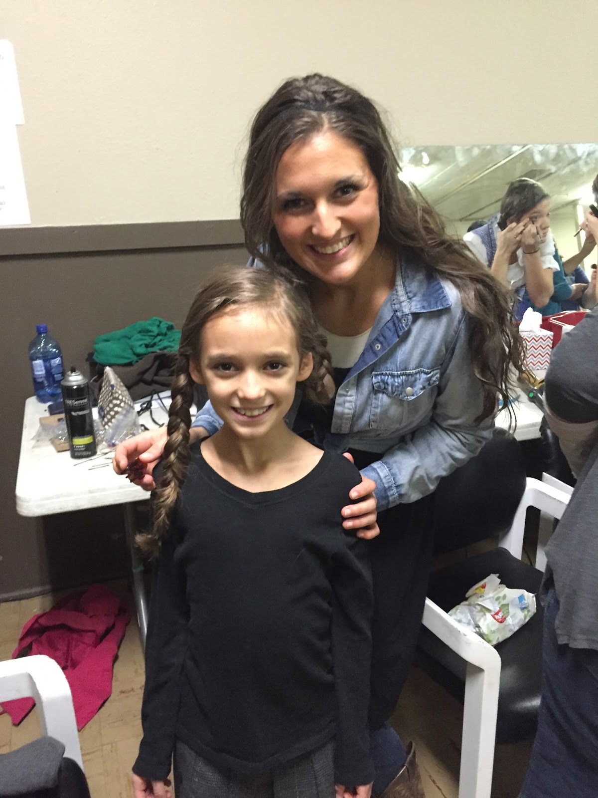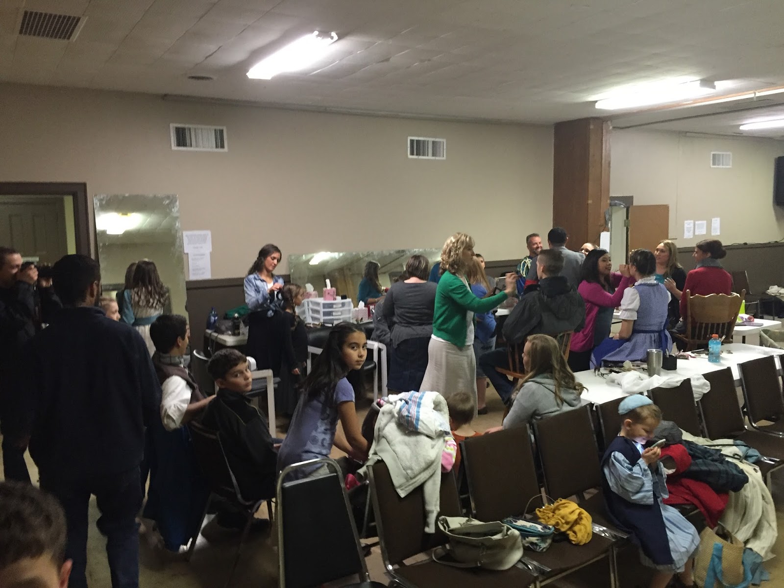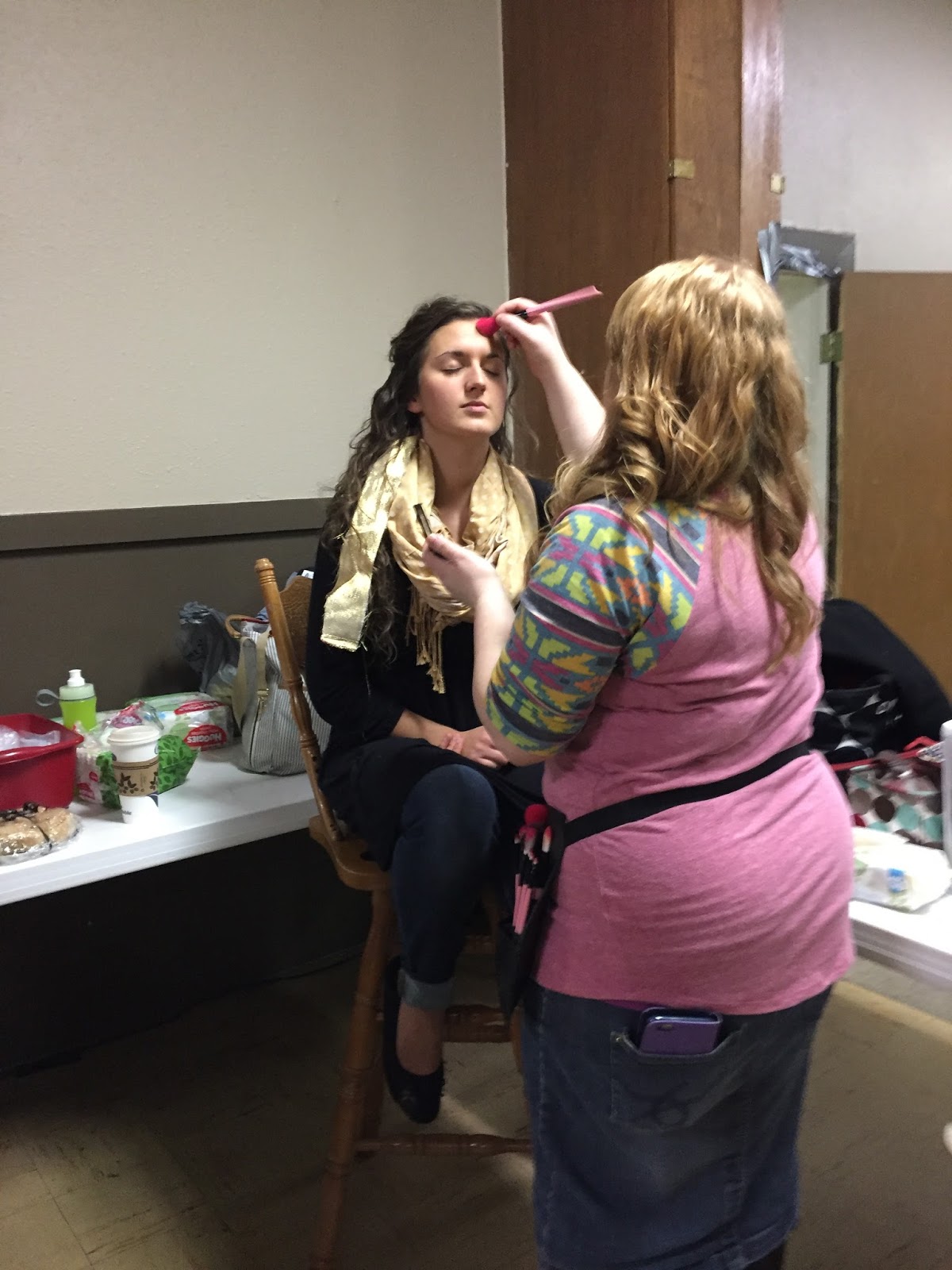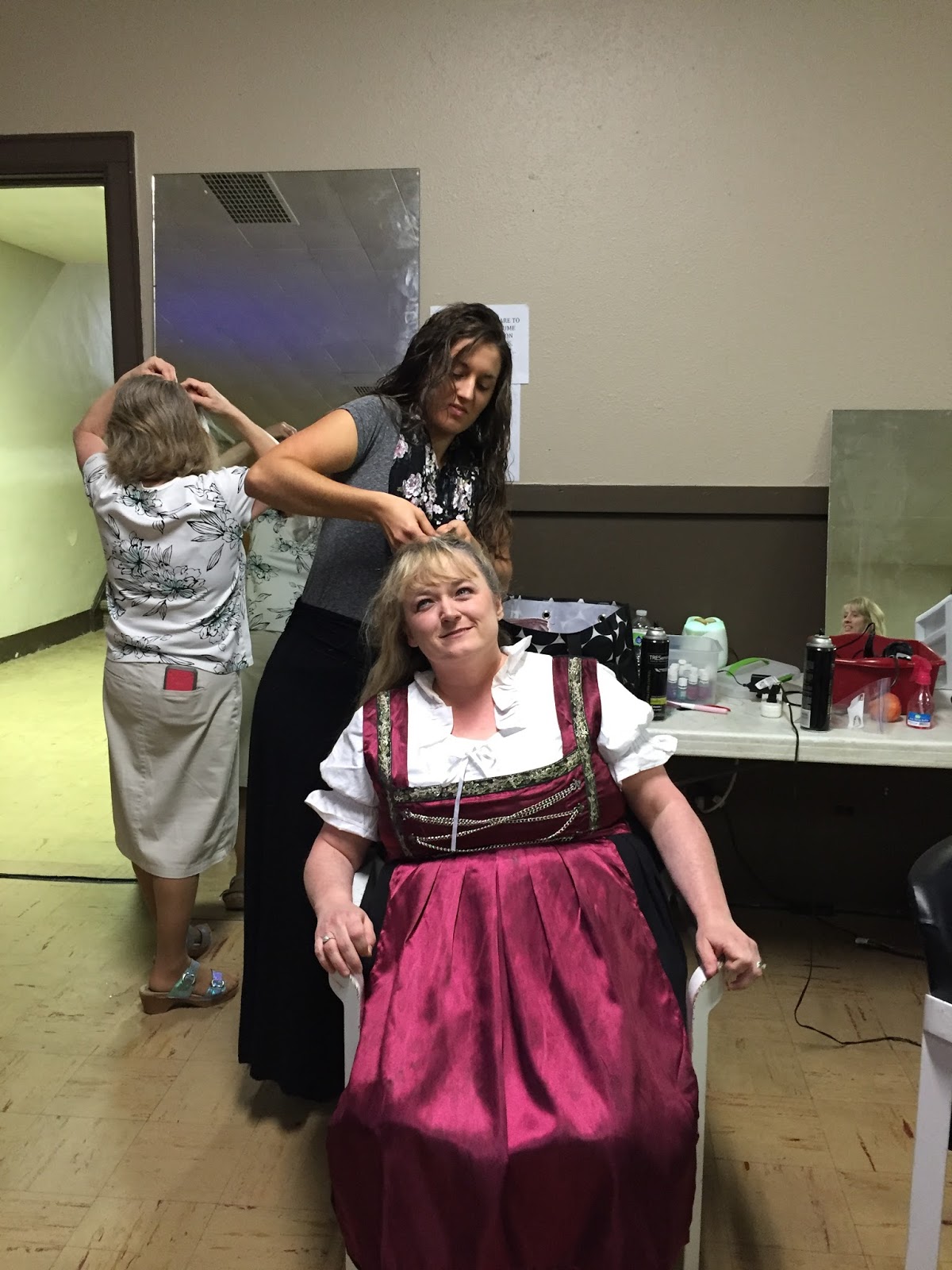 First off, we had the spacious, quiet, and luxurious loud, crowded fellowship hall room (above) in which hair and makeup happened. We had the greatest crew of ladies you could imagine who did hair and makeup for ALL of the actors. Allison worked on this crew again this year, doing several of the Swiss ladies’ hairstyles.