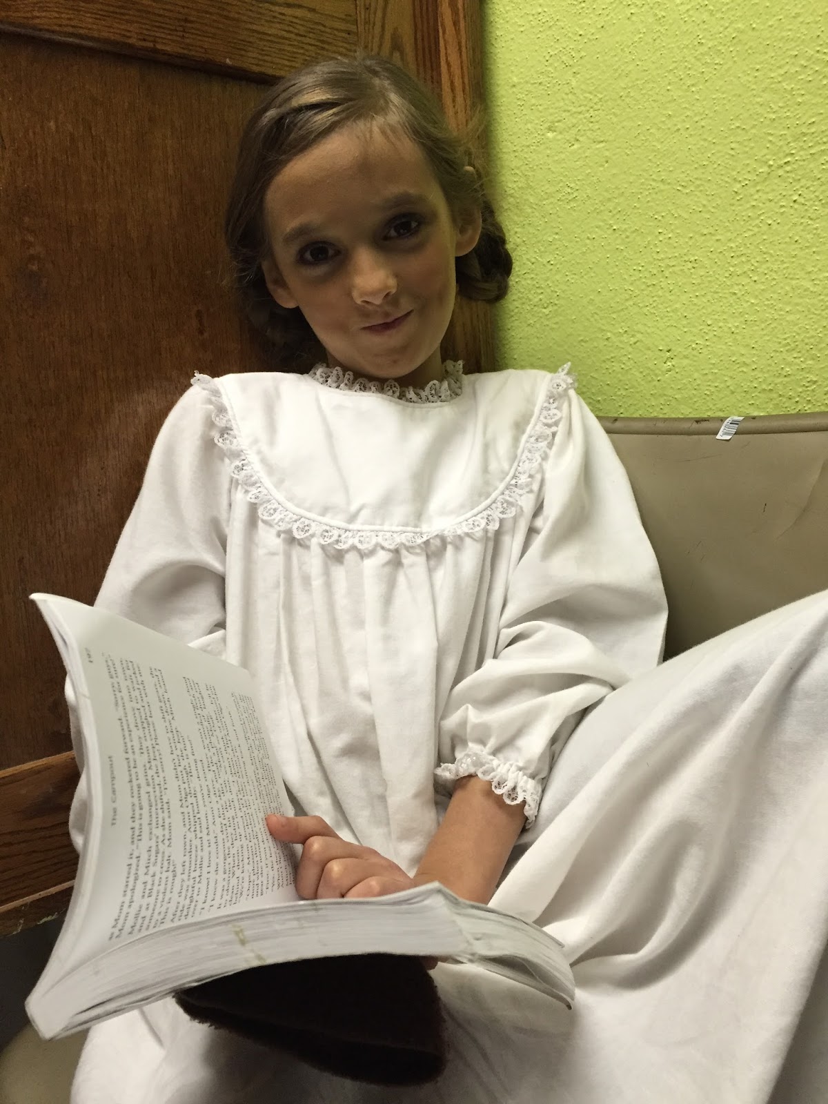 Little Miss Rebecca, clad in her sweet white nightgown, reading in her dressing room, in between her scenes.