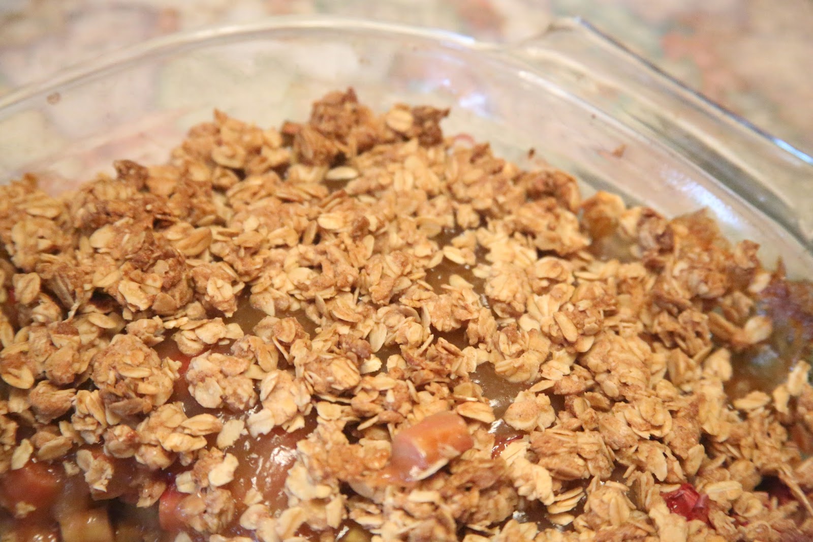 Healthy rhubarb crisp with fresh rhubarb from our garden.