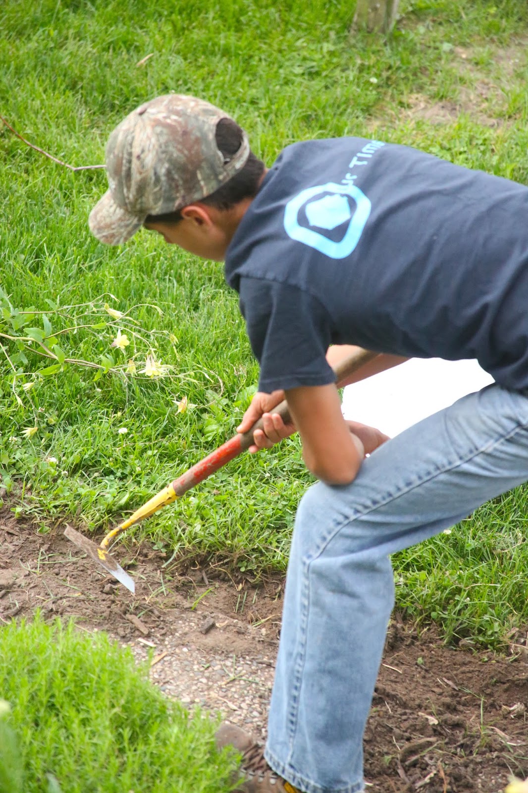 Sometimes the guys are able to join the garden crew for a little bit! On this particular day, we were scurrying to get all the mulching done before the predicted rain hit, so it was “all available hands on deck”!