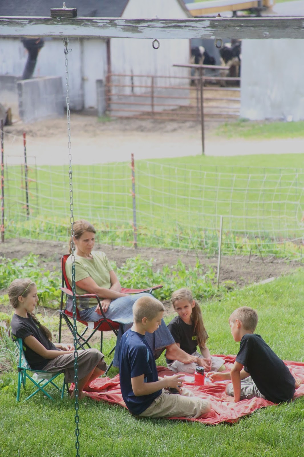 Mom + the chillens, enjoying Bible time out in the summer sunshine.