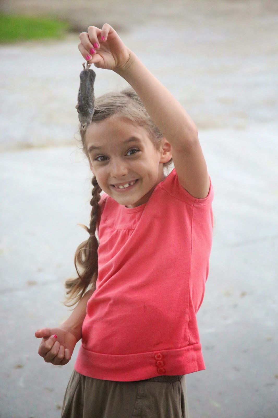 This child. She is scared of nothing, almost. Here she is carrying out a dead mouse that she found in front of the house. Leave it to Rebs. =)