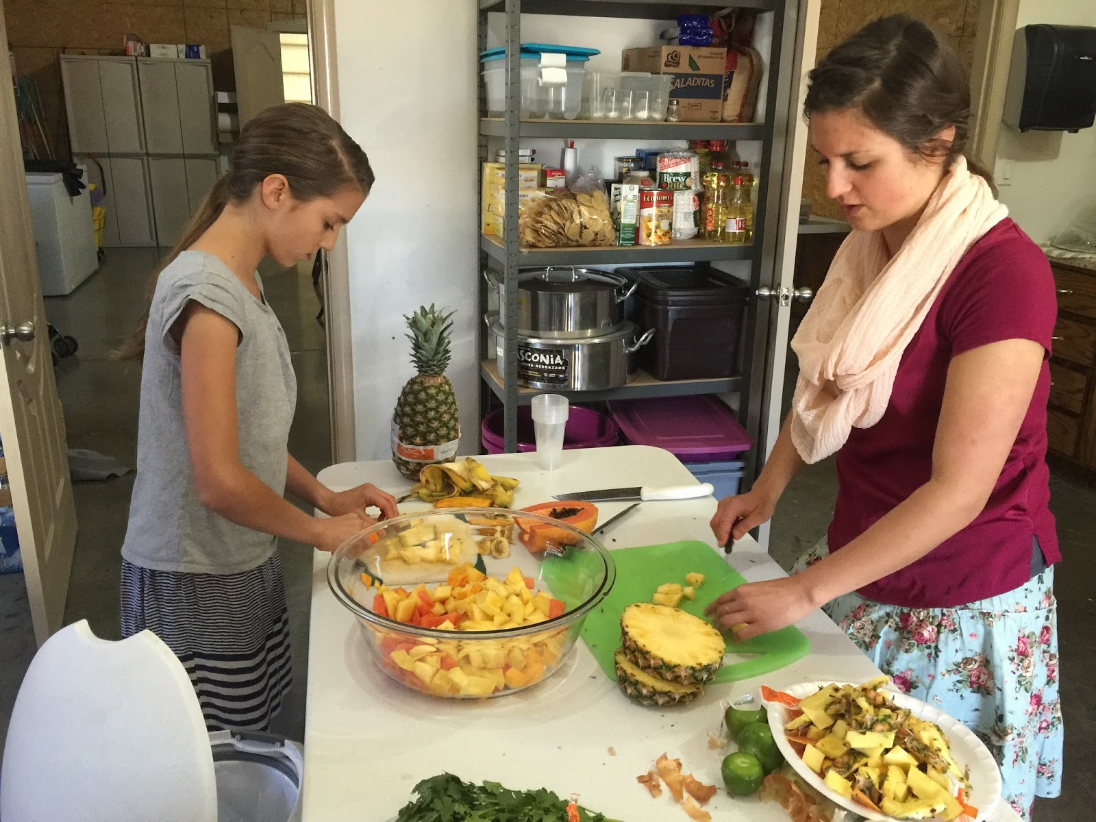 Liz and Allison cutting fruit one morning in a church kitchen.