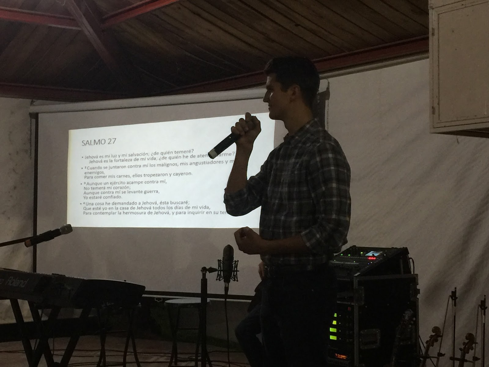 Josh sharing the Word in our evening concert. This was our only concert in which our audience was almost exclusively Spanish. Most of our concerts in Mexico are with the German Mennonites there, so we usually have translating done in German. But this night, our hosts were the pastors of a Spanish church, so they put all of our lyrics to our songs up on a screen, translated into Spanish, and the pastor and his wife translated all of our testimonies as well.