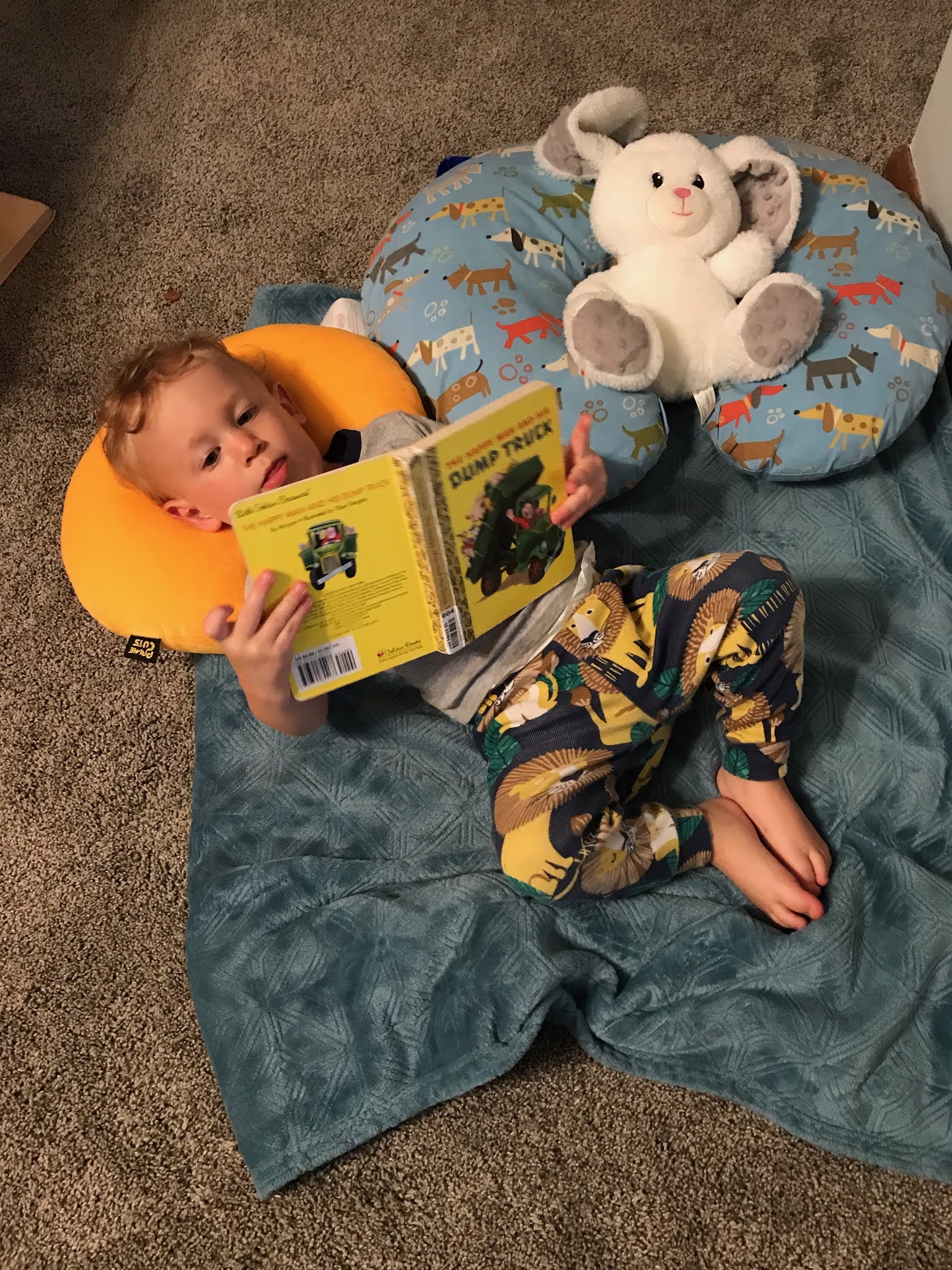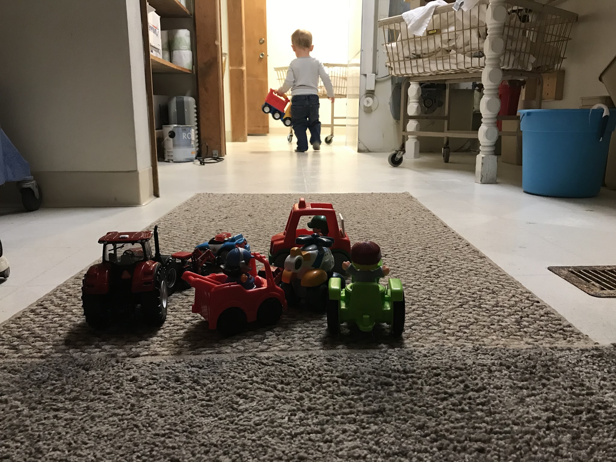 But he is especially thrilled whenever he gets to go “updear”(the upstairs of the farm house) to play with all the uncles tractors!