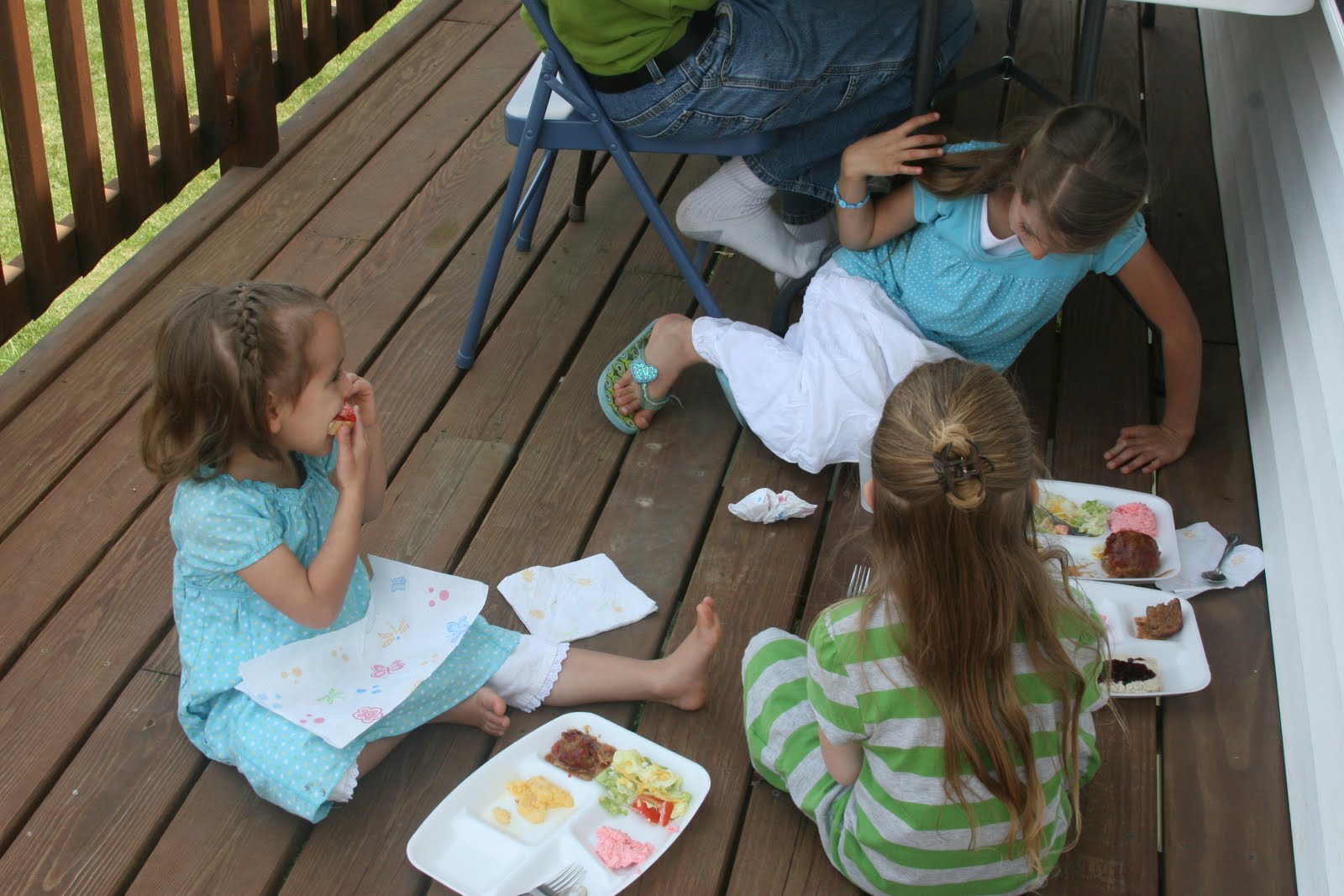 Aunt Vesta and Aunt Linda planned a delicious menu of little meatloaves, cheesy potatoes, lettuce salad, jello salad, bread, and dessert. The children ate in the sun on Grandma’s deck.