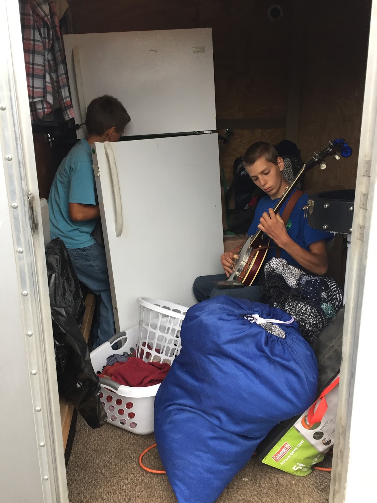 This is a great picture of the normal craziness. Bags of laundry everywhere. Taylor perched in the middle practicing banjo. Hudson trying to squeeze into the fridge to get some food for lunch.