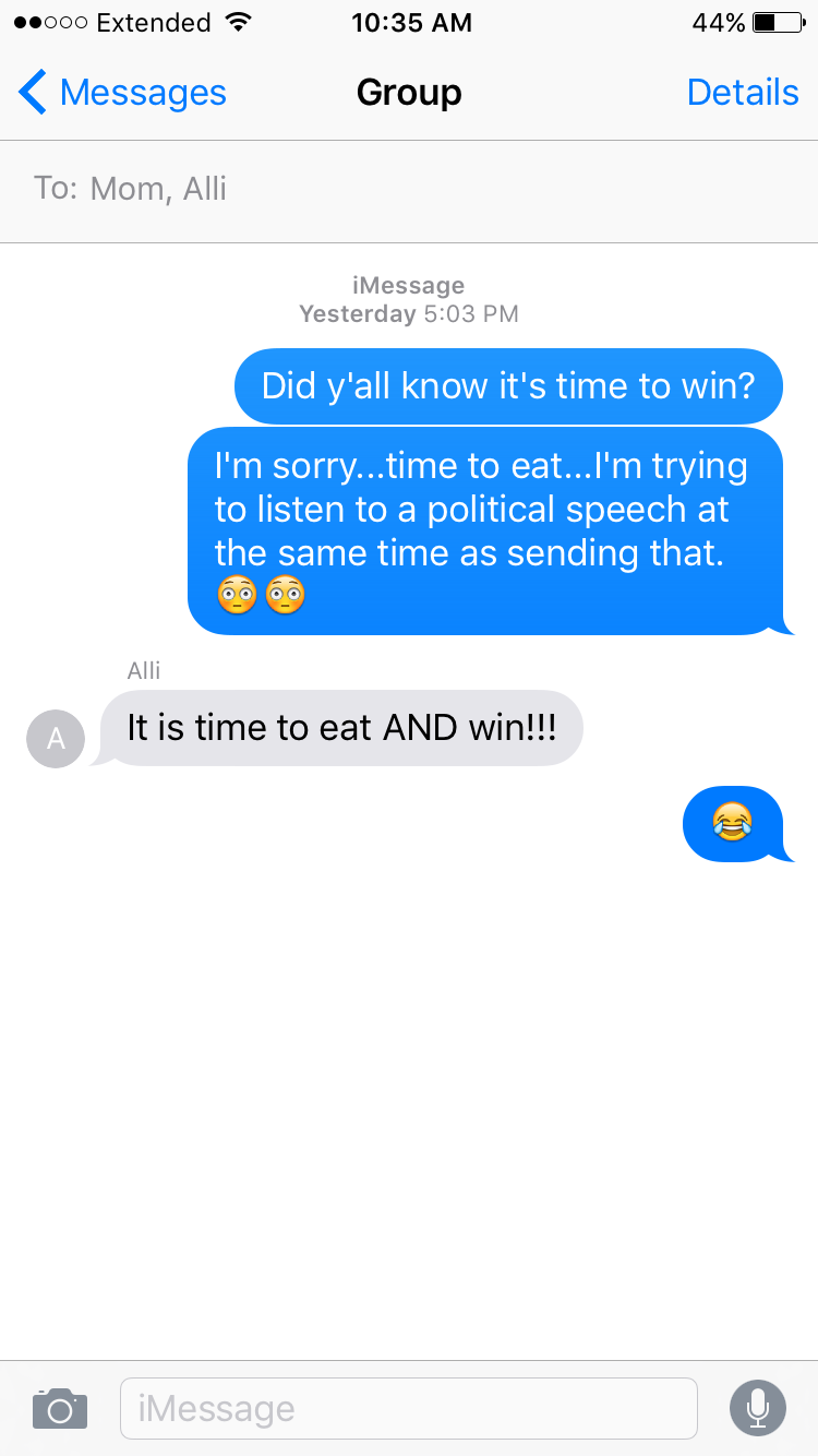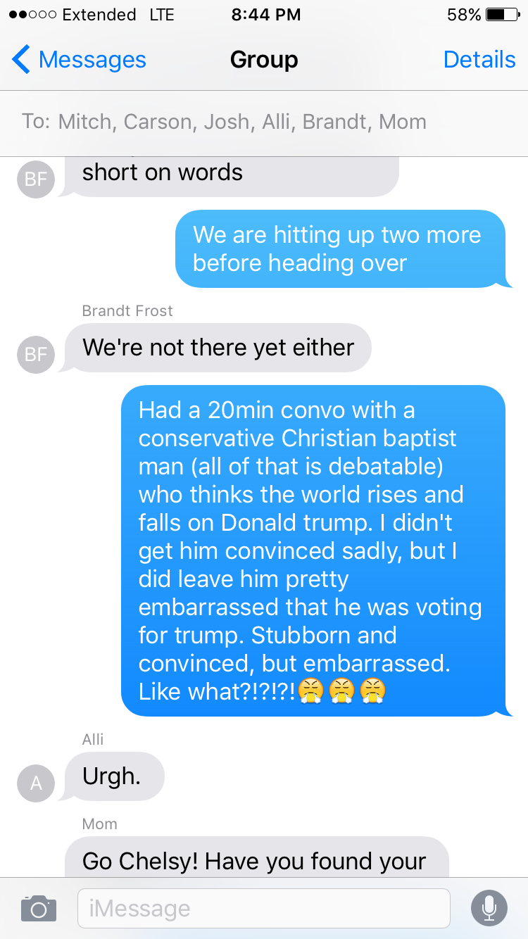 Did you quote me? I should go back in my group text history and see. That would take some searching. I love this. A great read, Chelsy. Taylor and Rebecca made by years with what they said. I think that between your family and me, we hit over 7500 doors in total. Just think, we knocked on more doors that the Trump Campaign has for the whole campaign cycle. Just us.