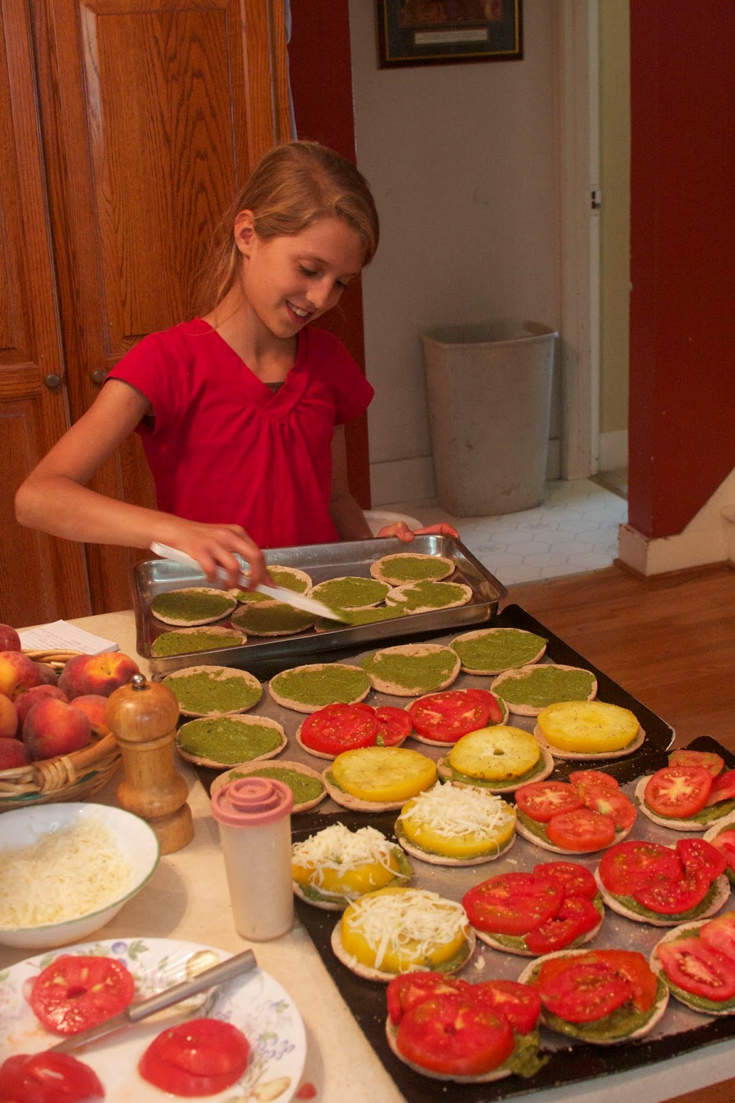 These tomato/cheese/pesto sandwhiches…….ahhh SO good! Just take a thin round (or piece) or bread, slather on some fresh pesto, add a few just-from-the-garden tomato slices, top with shredded mozzarella cheese, throw on a little salt and pepper, and broil in the oven till browned. Best eaten outdoors!