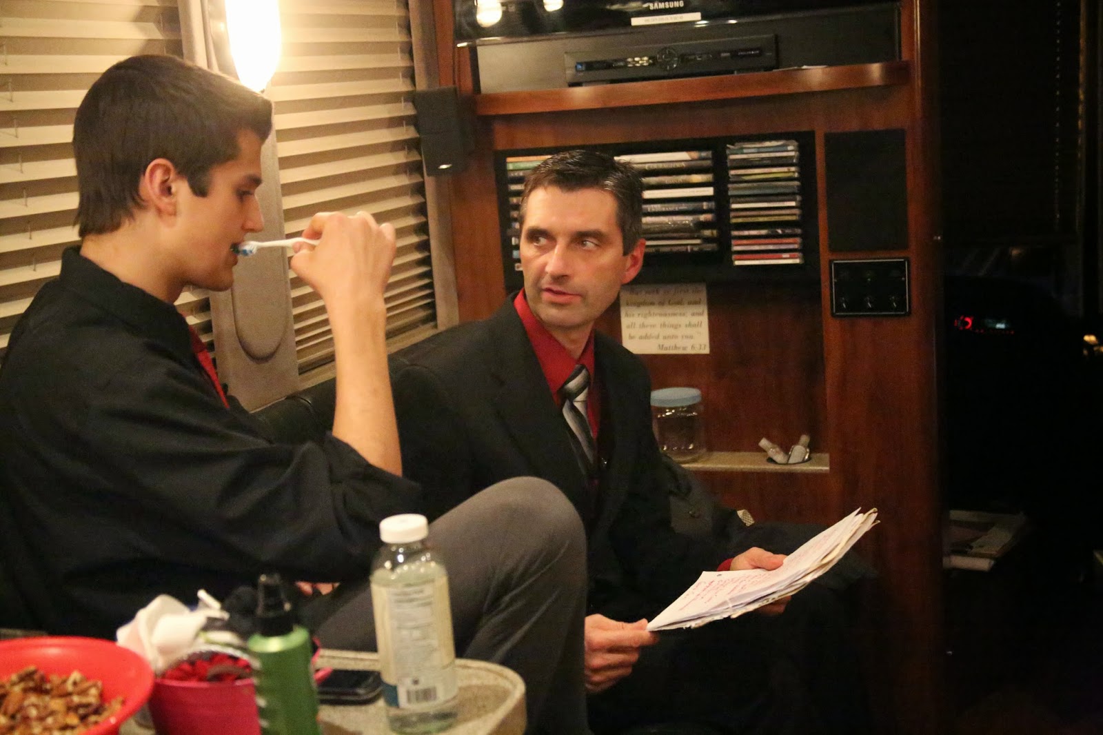 Dad and Josh discussing the song list as Josh brushes his teeth.