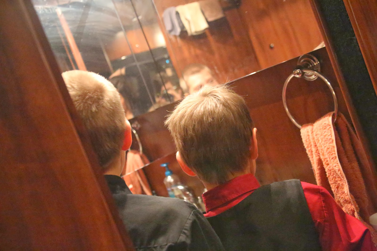 When you add together four men (read, “I need to get in the bathroom to shave NOW!!! or “I can’t find a COMB!!!!”:), three boys (sometimes needing last-minute assistance with hair combing or trimming), five females (and the ensuing tubes of lipstick, bottles of hairspray, curling irons, make-up, bobby pins, etc!), and limited time and space, it gets pretty interesting-to say the least.:)