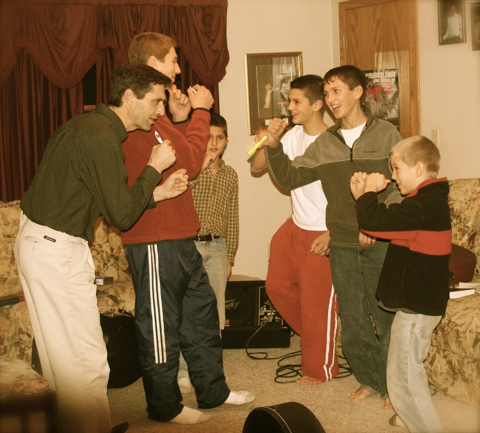 Yes, I guess it does look rather strange! The guys are actually (can you believe it?) practicing a new song. "When the Roll is Called Up Yonder" will be the first song sung by the Bontrager men in four part harmony. ~Allison