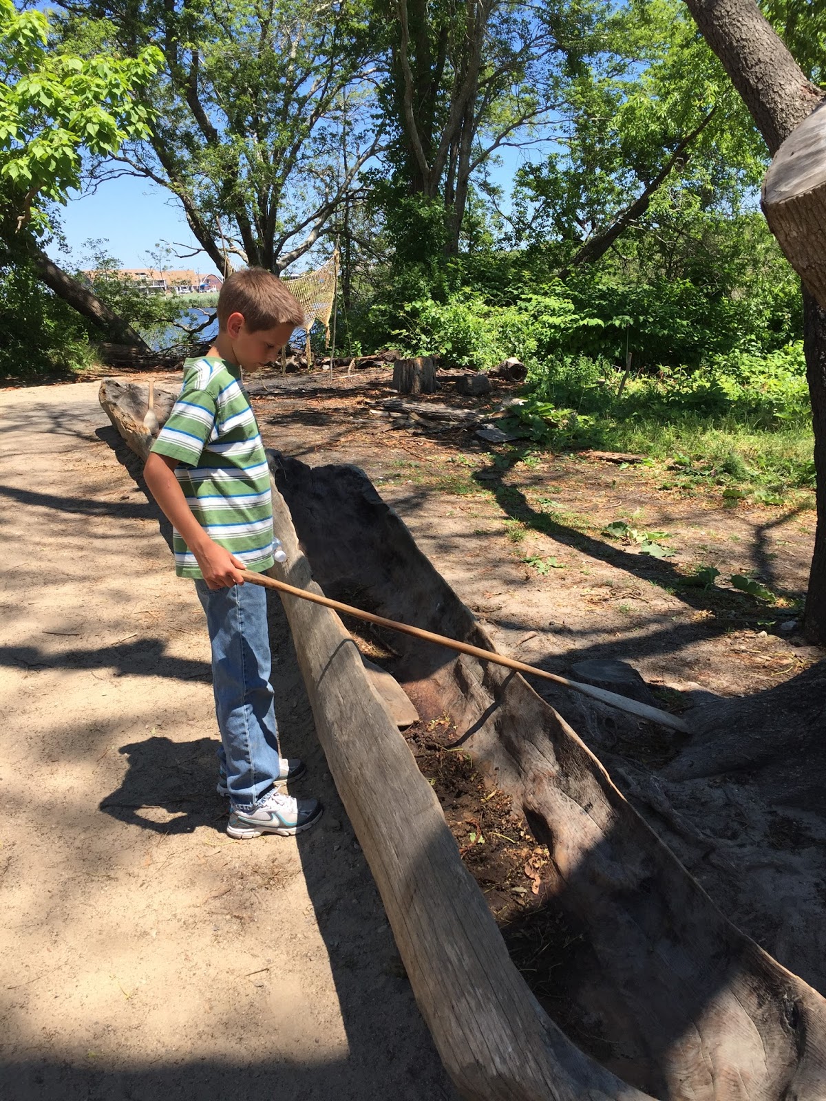 Hudson observing a replica of a dugout canoe like the Indians would’ve used.