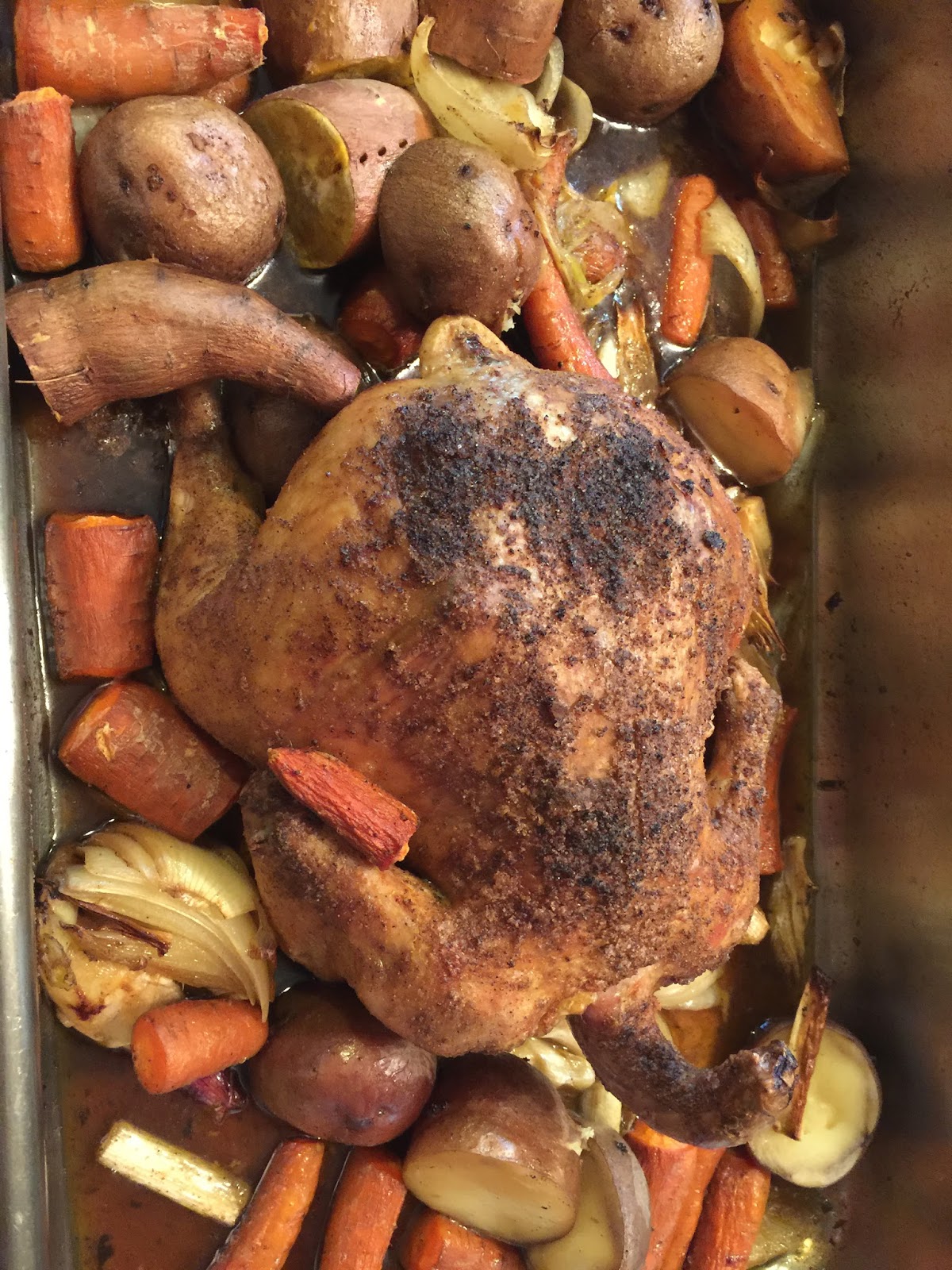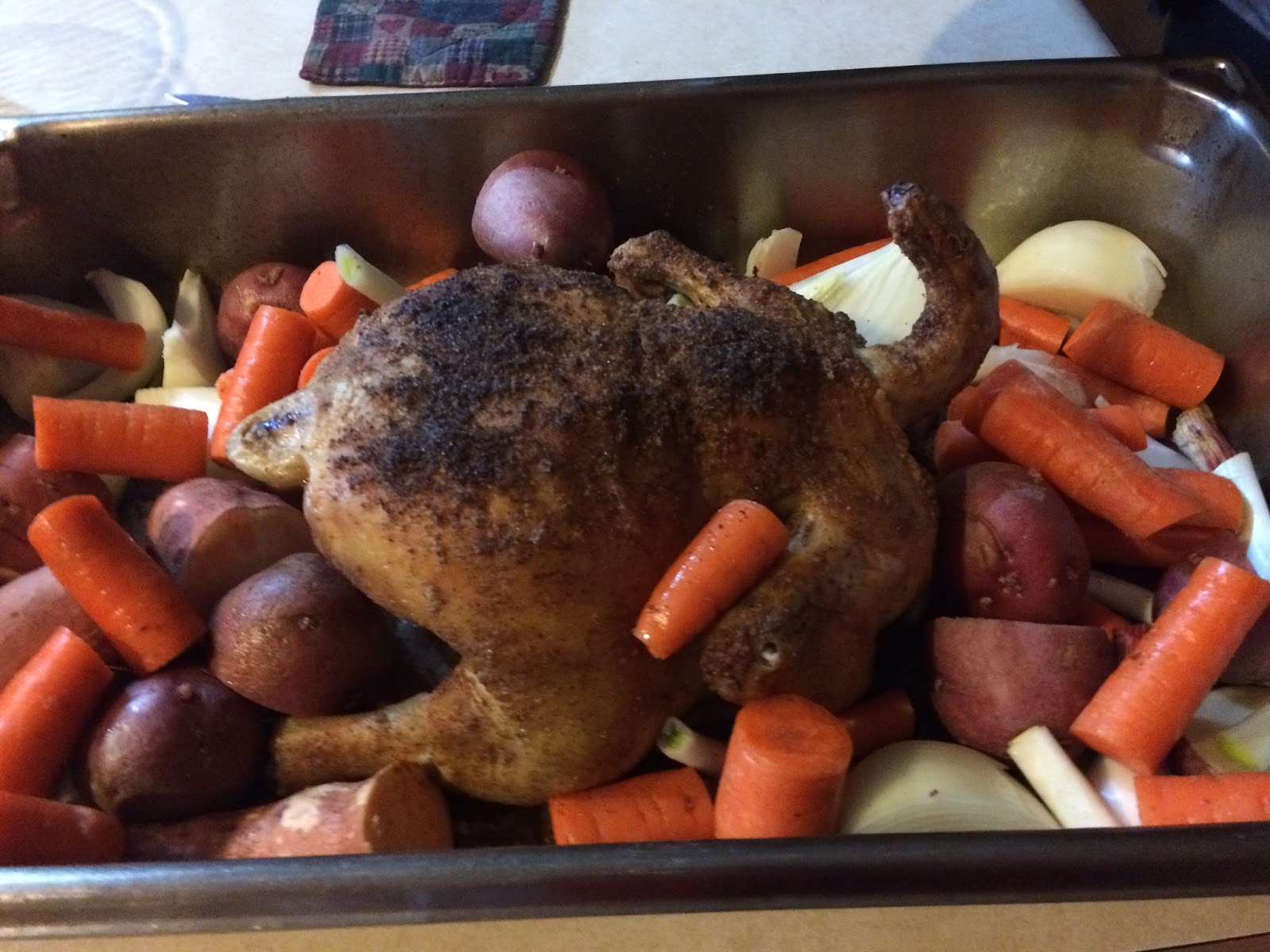 After the 45 minutes, remove the chicken from the oven and add a variety of potatoes, sweet potatoes, butternut squash, beets, carrots, garlic, and/or onions. Turn the oven to 290 and return chicken and vegetables to oven.