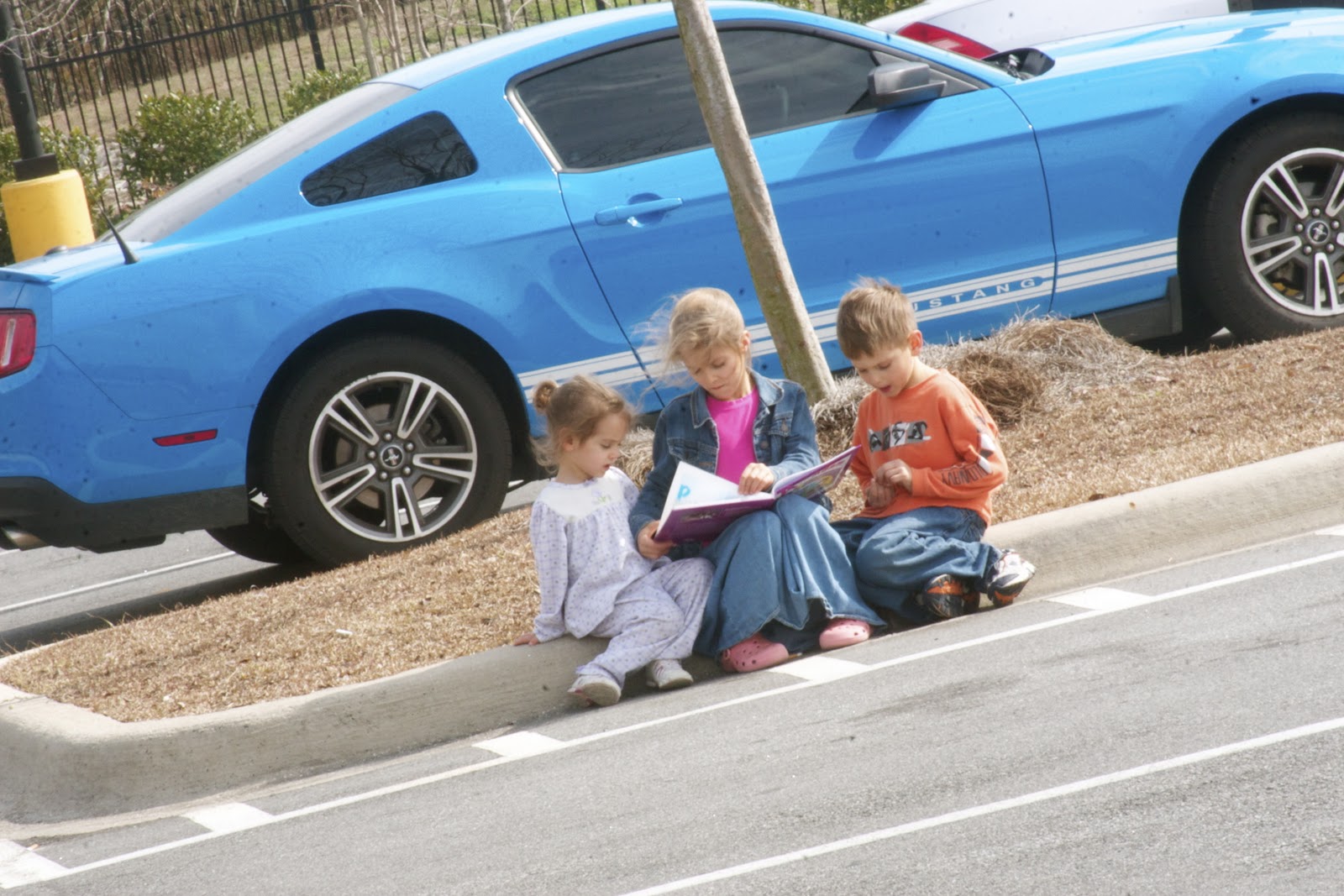 Elizabeth read a story to Hudson and Rebecca beside this cute blue car in a WalMart parking lot where we parked for several hours. Dad and the boys played football closeby.