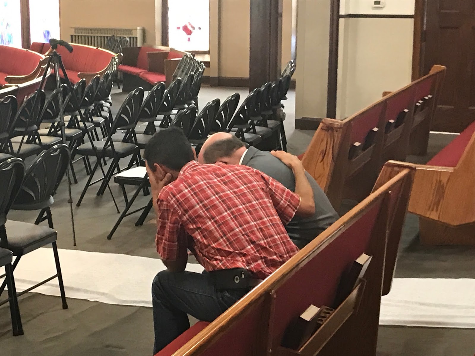 Day two, Saturday, ready to go at it again! Someone snapped this picture in the church auditorium, the morning of the wedding—father of the groom and father of the bride, asking God’s blessing on the coming day.