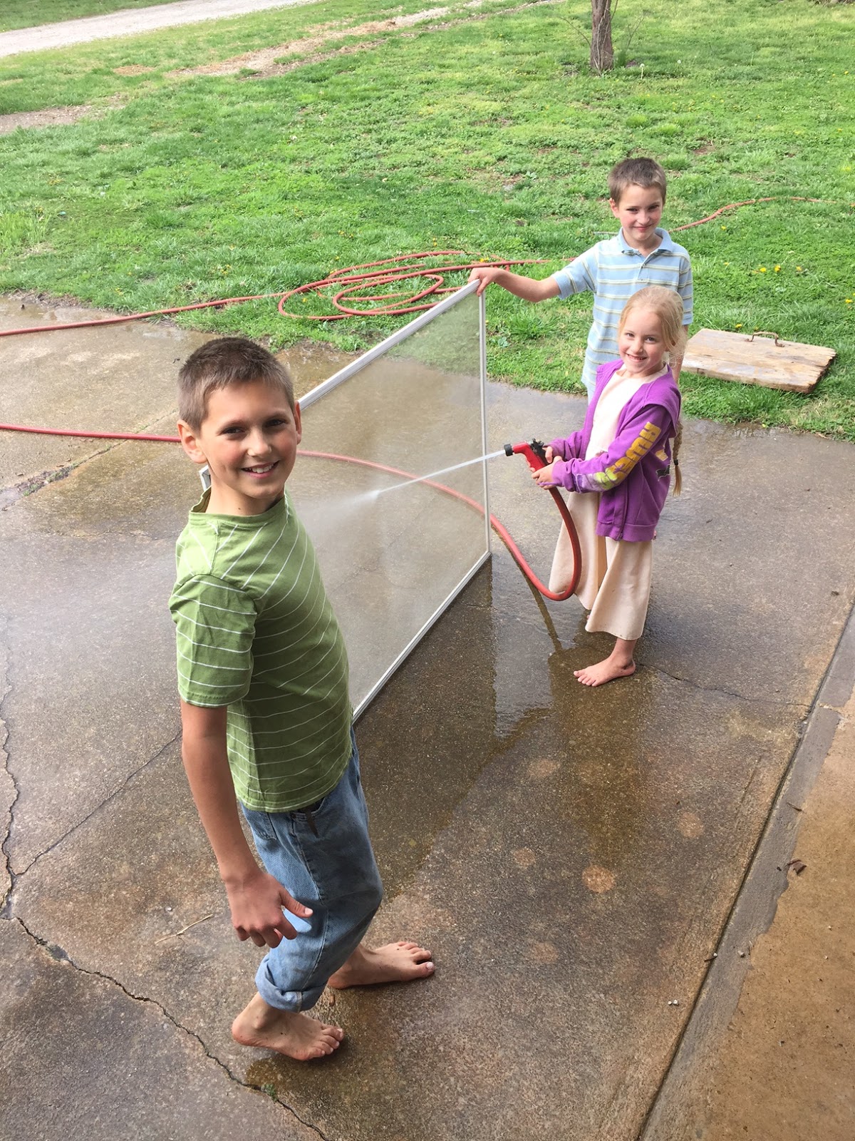 Mom and Allison helped wash windows at our relatives one morning. Hudson + the cousins got to be the “screen scrubbing” crew. Not sure which got more wet—the screens or them. =)