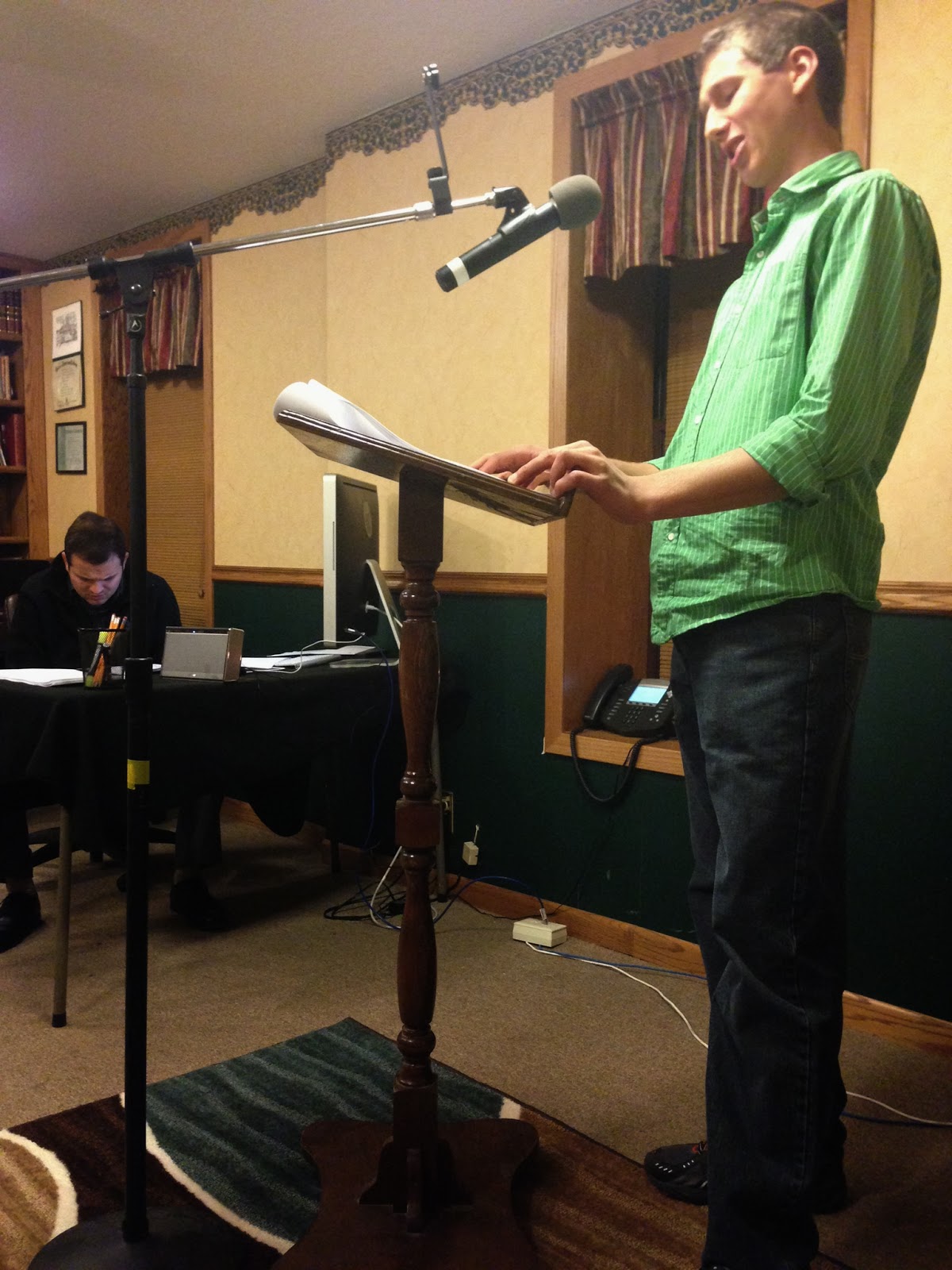 Josh on stage during Senior Division Semi-Finals at Bible Bee.