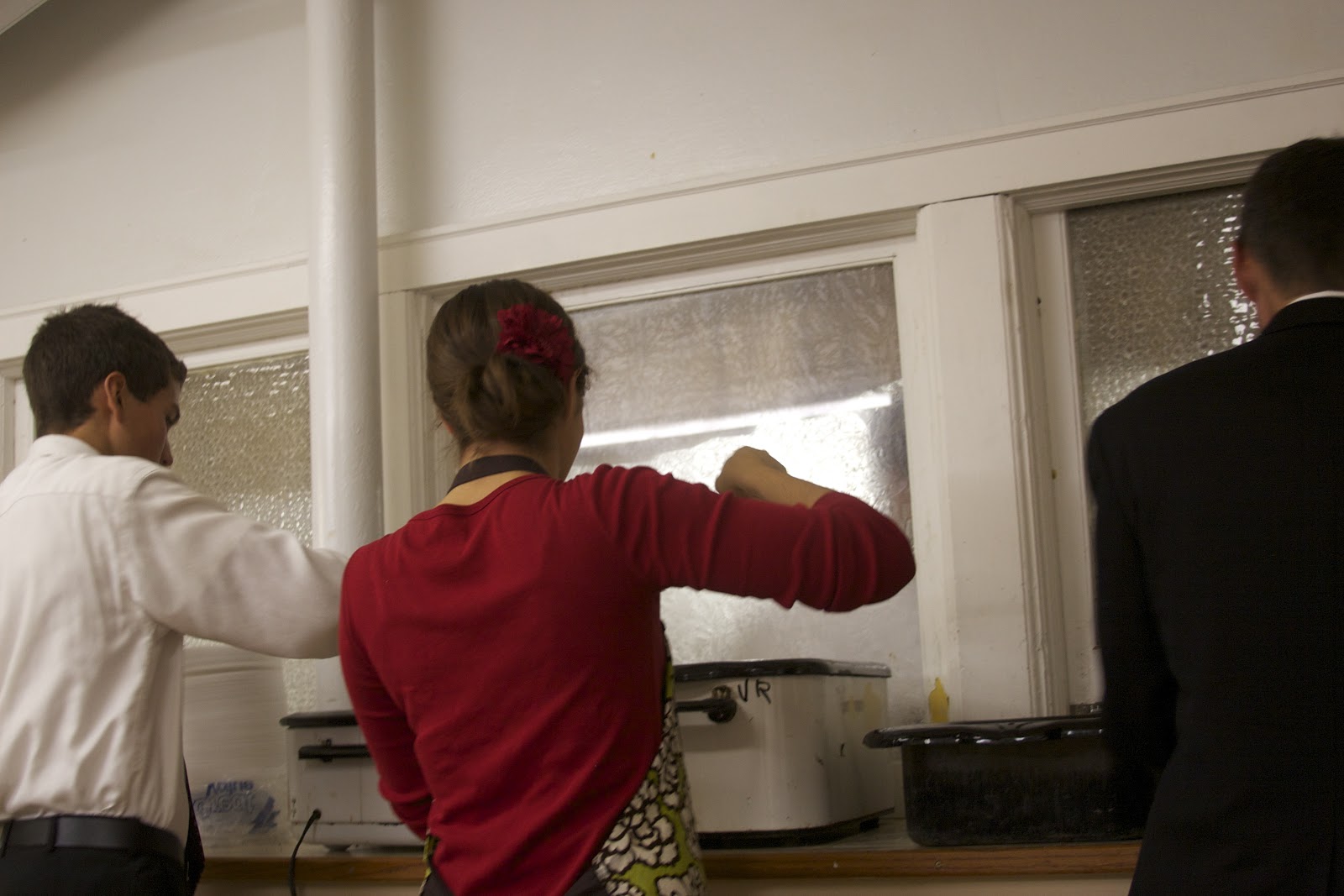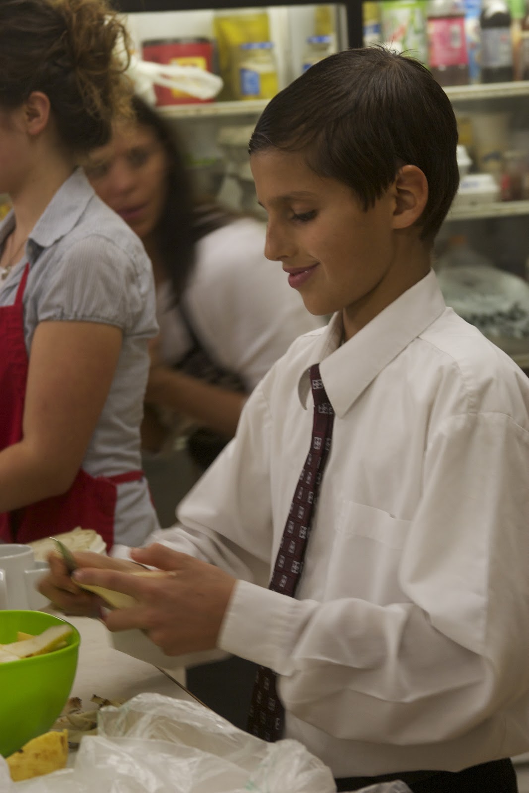 In the church kitchen, Sunday morning. From L to R: Joshua cutting apples, mom & Allison washing lettuce, & Denver slicing pears