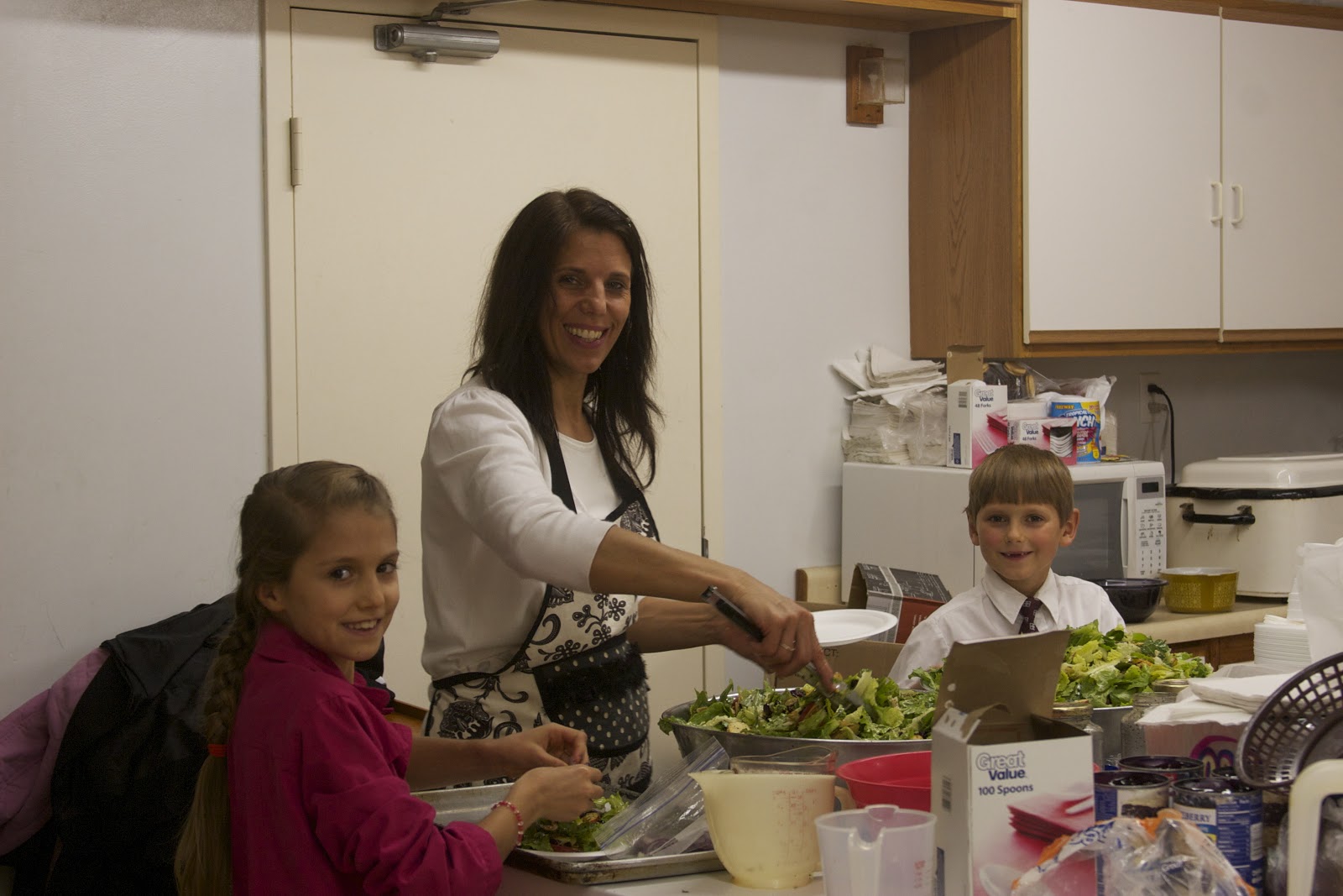 Mom with her salad crew of Liz & Hudson, preparing individual salad plates for each person.