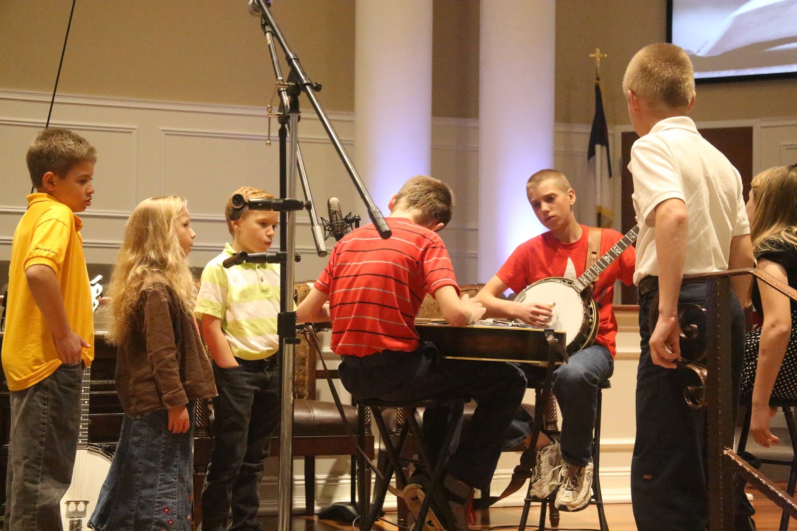 The little girls, practicing a new violin duet that they are preparing for a new set.