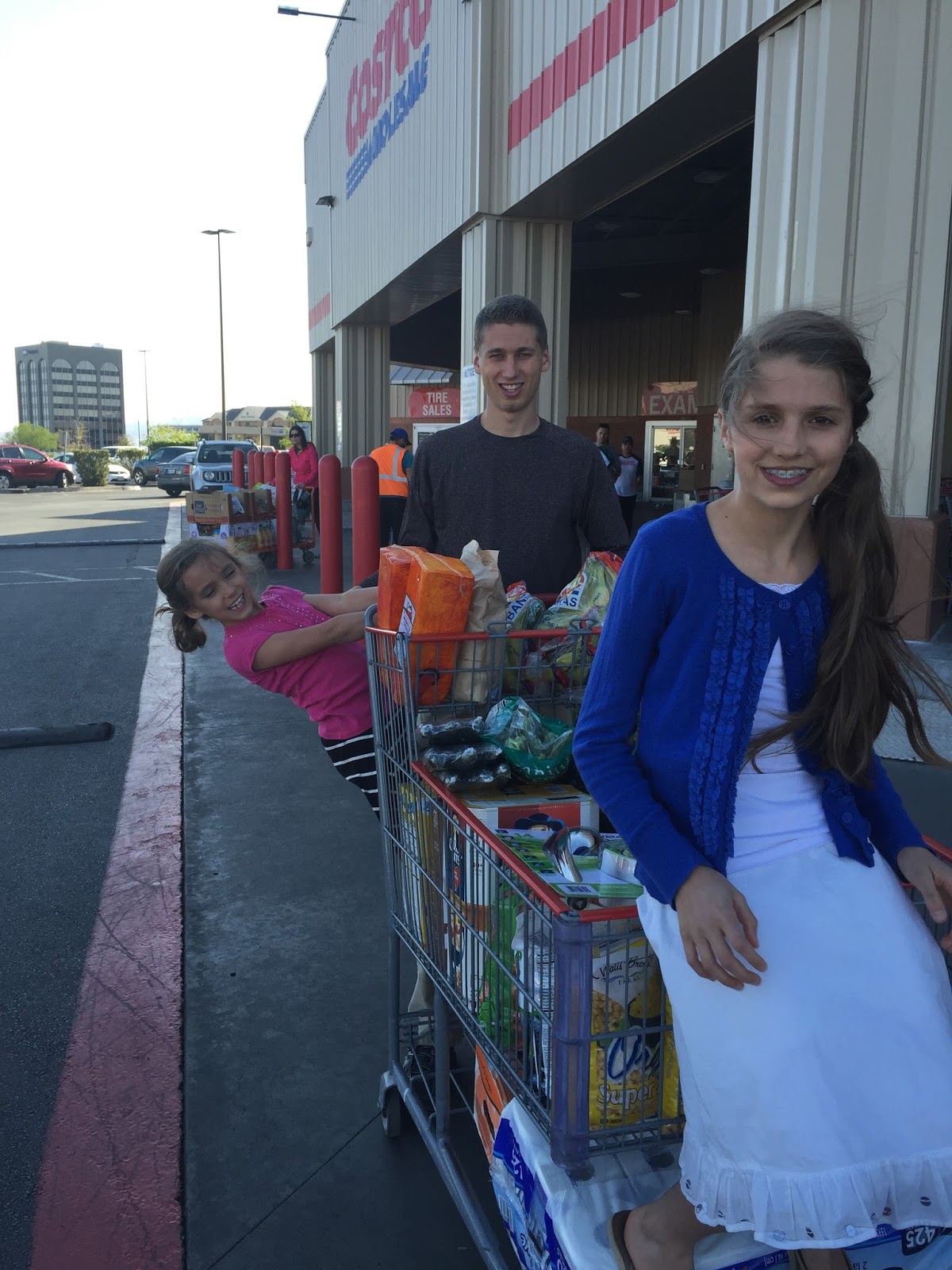 As previously mentioned in more than one post, Costco is our best friend and keeps us fueled both at home and abroad. =) When we are on tour, sometimes the guys help out with the shopping. Above, Mitchell, Liz, + Rebs, after one such fruitful expedition.