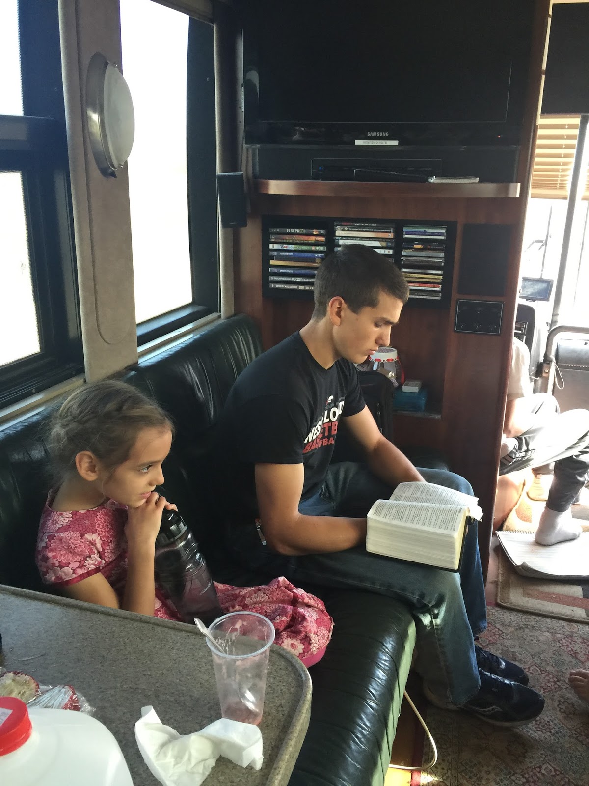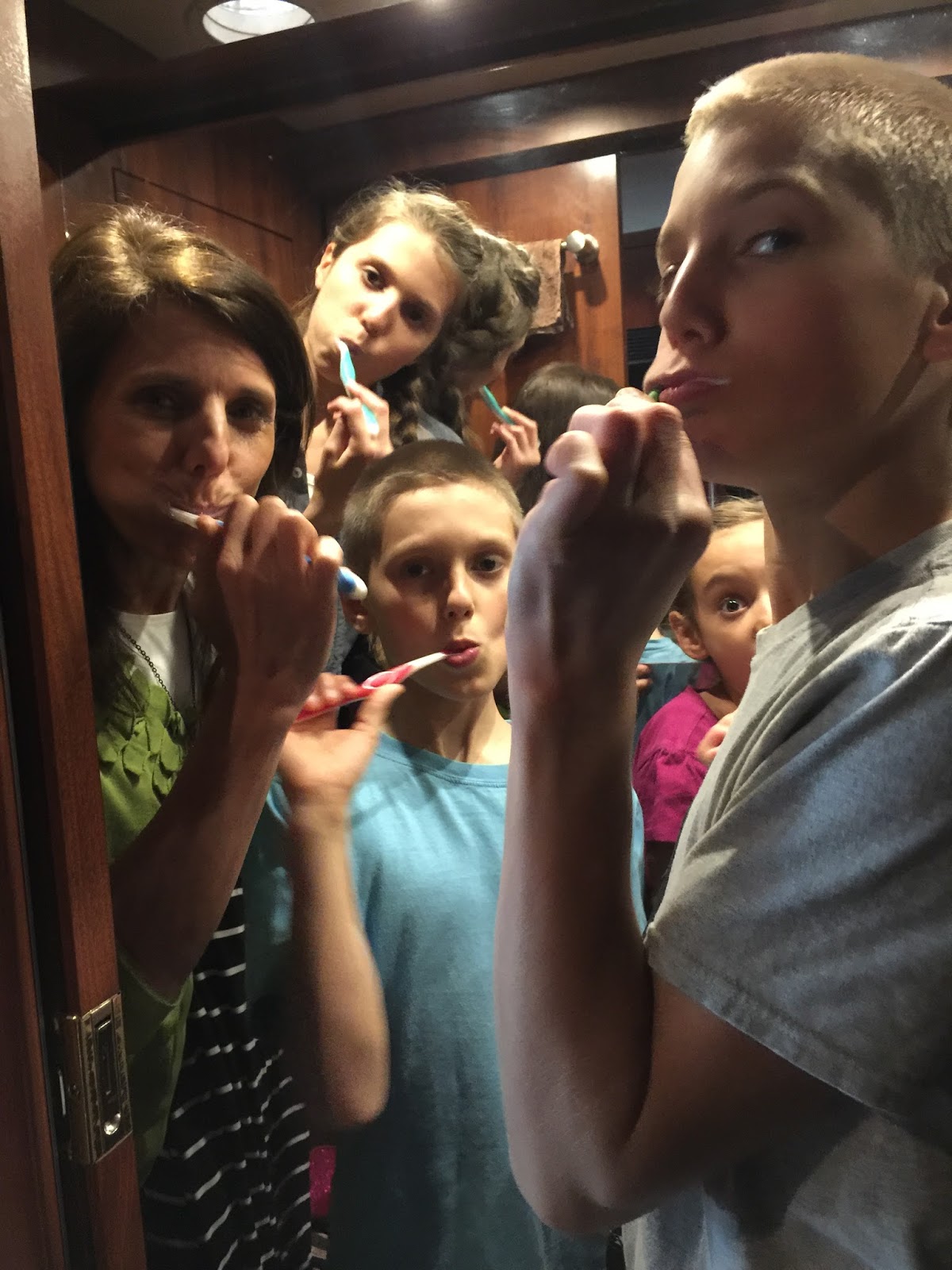 The toothbrushing phenomenon. I think this moment could fit into the “most people squeezed into the smallest space brushing teeth at the same time” book of records. If there was such a thing, that is. I’m thinking about authoring a book called “The Book of Bus Records” where families that travel in buses could compete for various records held for various things. Only problem is, half of the records probably wouldn’t even be appropriate enough to put in a book. Whoops. So never mind on that. =)
